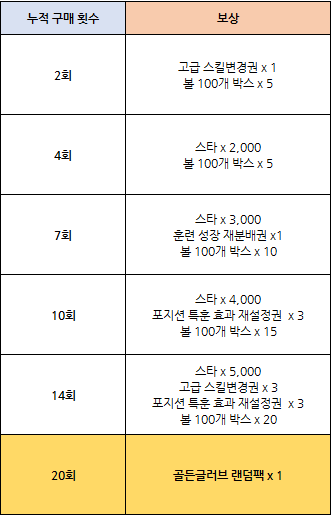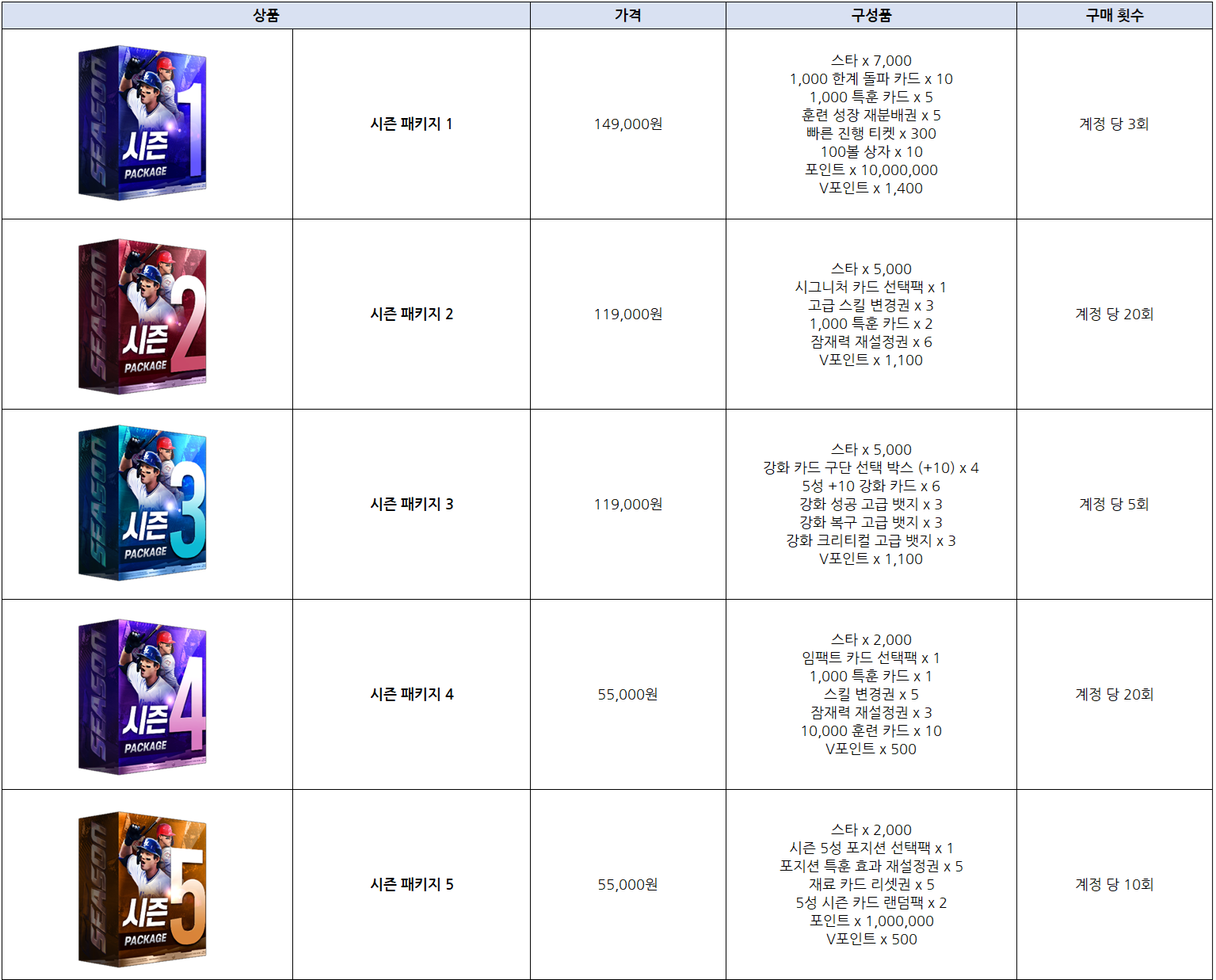- 금액 상관 없이 시즌 패키지 구매 누적 횟수에 따라 추가 보상을 획득하실 수 있습니다.
