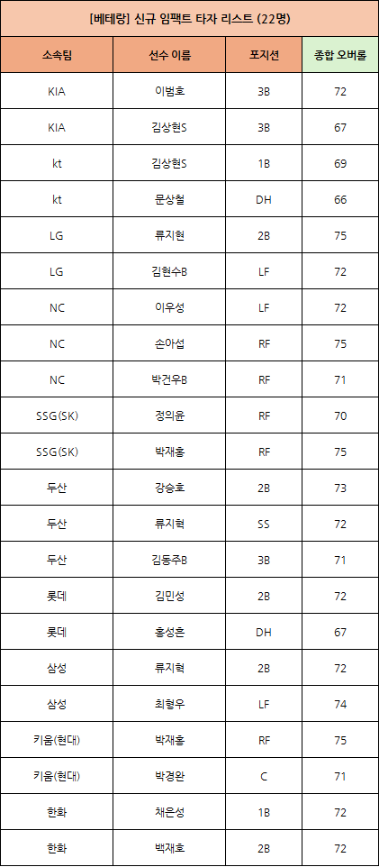 <[베테랑] 신규 임팩트 타자 카드 (22명)>