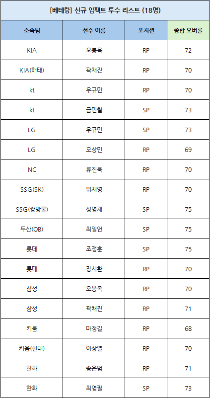 <[베테랑] 신규 임팩트 투수 카드 (18명)>