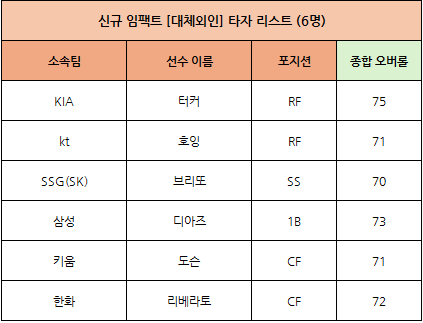 <신규 임팩트 [대체외인] 신규 타자 카드 (6명)>