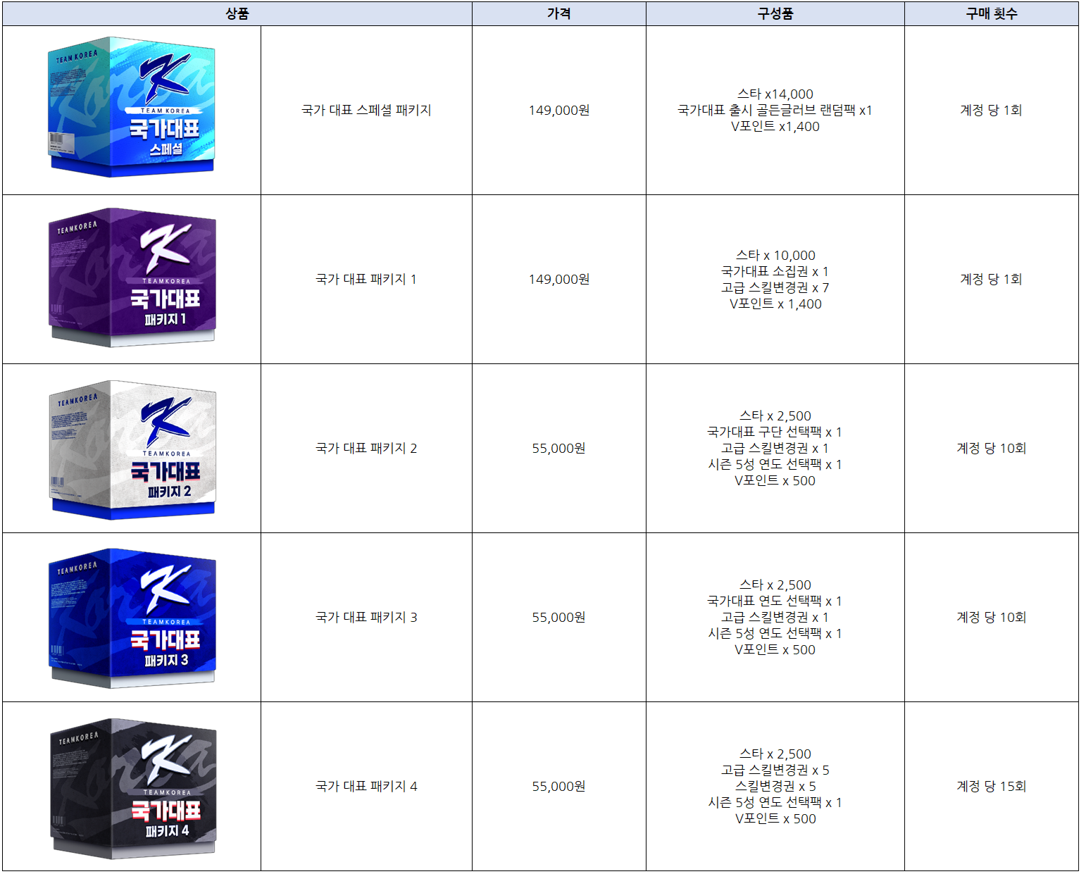 - 국가대표 패키지 구매 누적 횟수에 따라 추가 보상을 획득하실 수 있습니다.