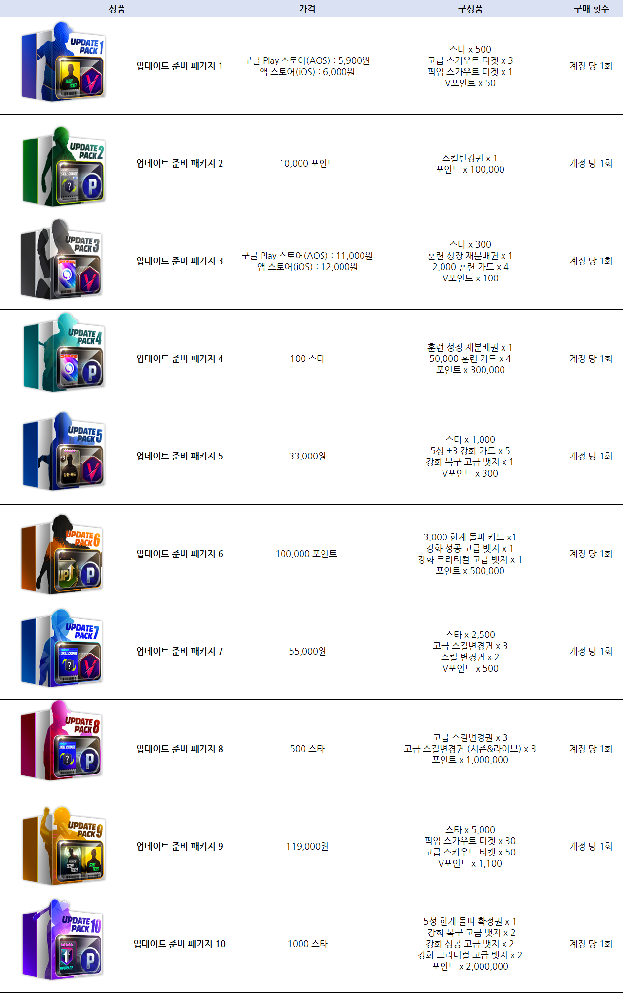 - 업데이트 준비 구매 패키지 10종이 판매됩니다.