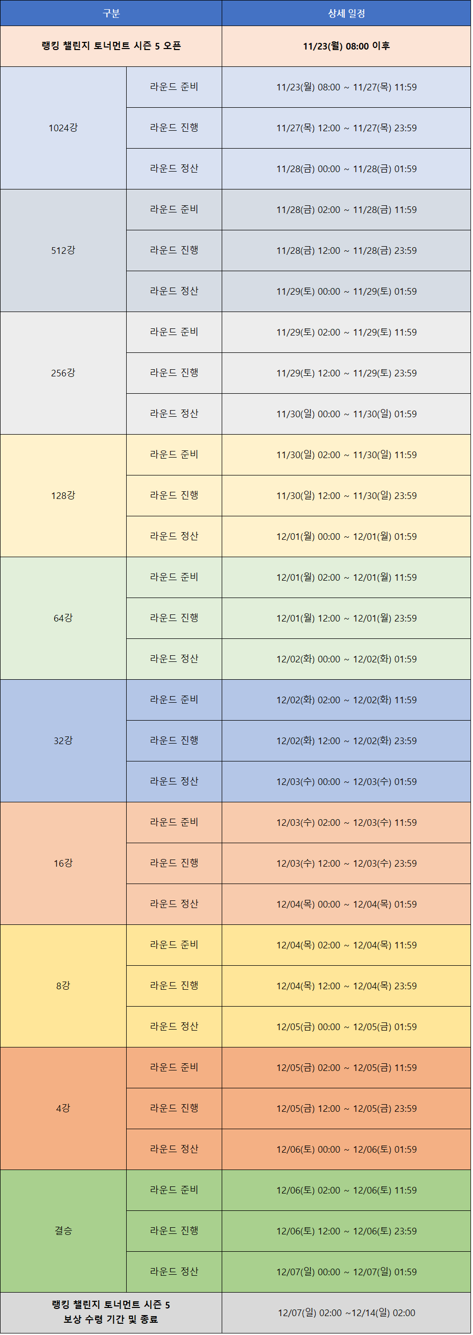 - 랭킹 토너먼트는 하루에 1개의 라운드가 진행되며 02:00 ~ 12:00까지는 라운드 준비 기간,