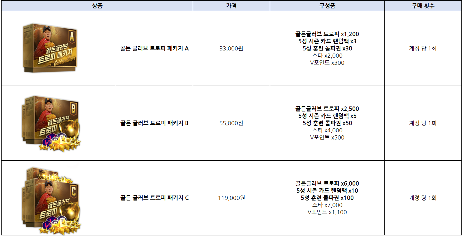 다량의 골든 글러브 트로피를를 획득하실 수 있는 골든 글러브 트로피 패키지를 준비하였습니다.