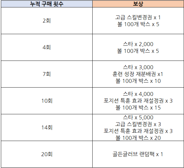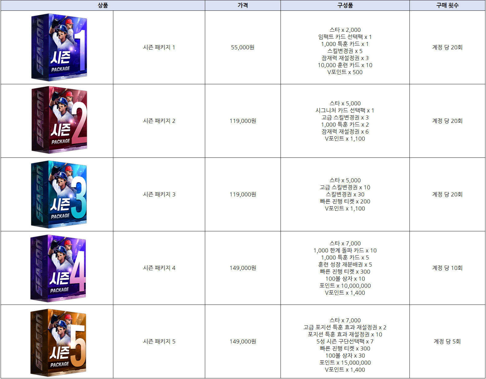 - 금액 상관 없이 시즌 패키지 구매 누적 횟수에 따라 추가 보상을 획득하실 수 있습니다.