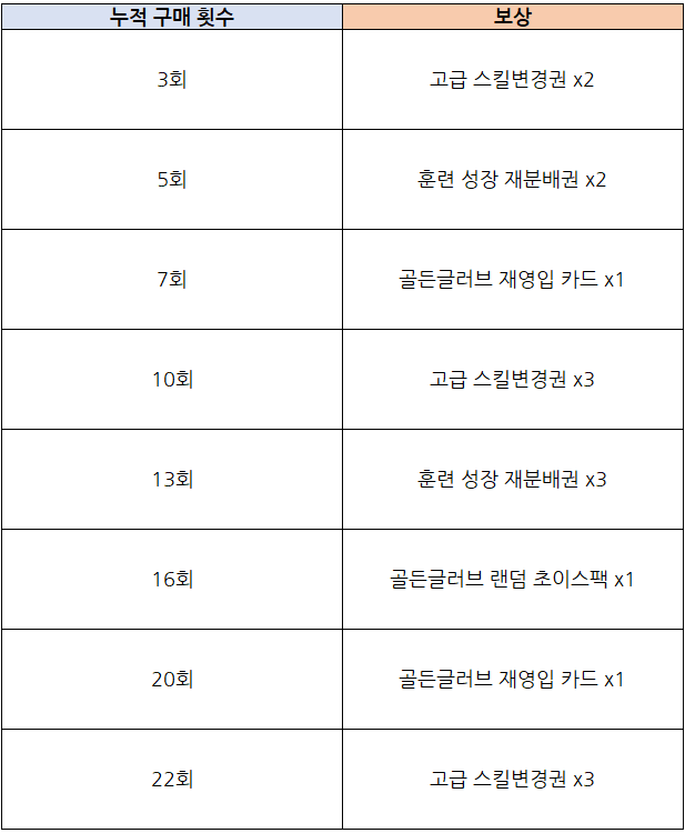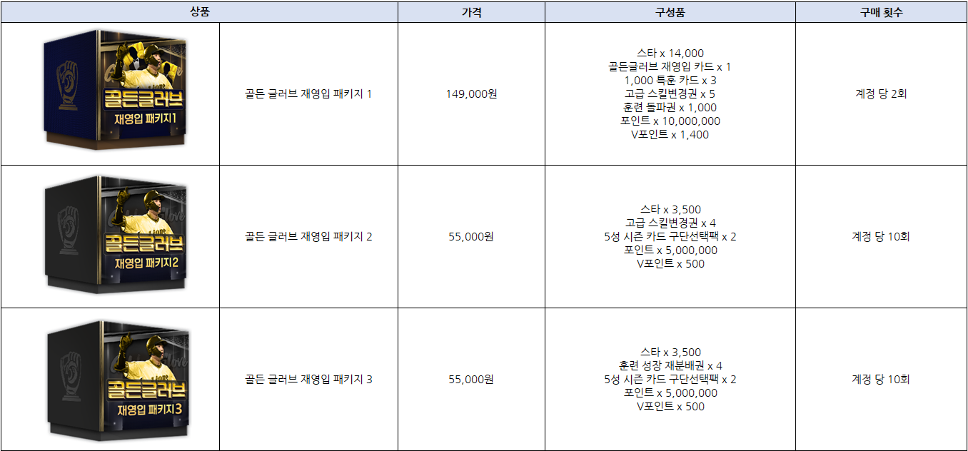 - 골든 글러브 재영입 패키지 구매 누적 횟수에 따라 골든글러브 재영입 카드 등 추가 보상을 획득하실 수 있습니다.
