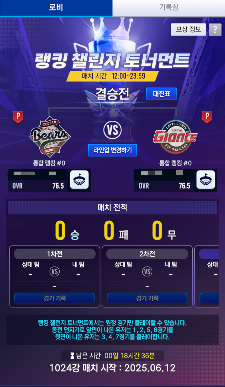 - 토너먼트 라인업은 랭킹 챌린지 라인업과 별도로 구성할 수 있습니다.