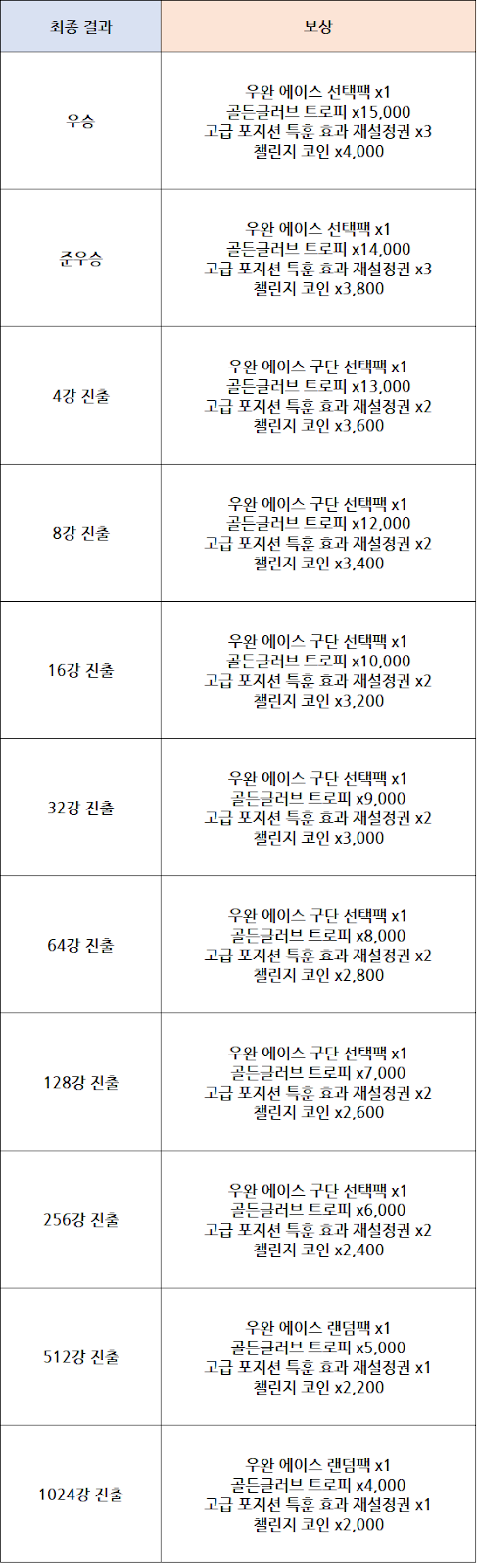 - 라운드의 경기별 결과 및 라운드 진출 여부에 따라 각각 보상을 획득할 수 있습니다.