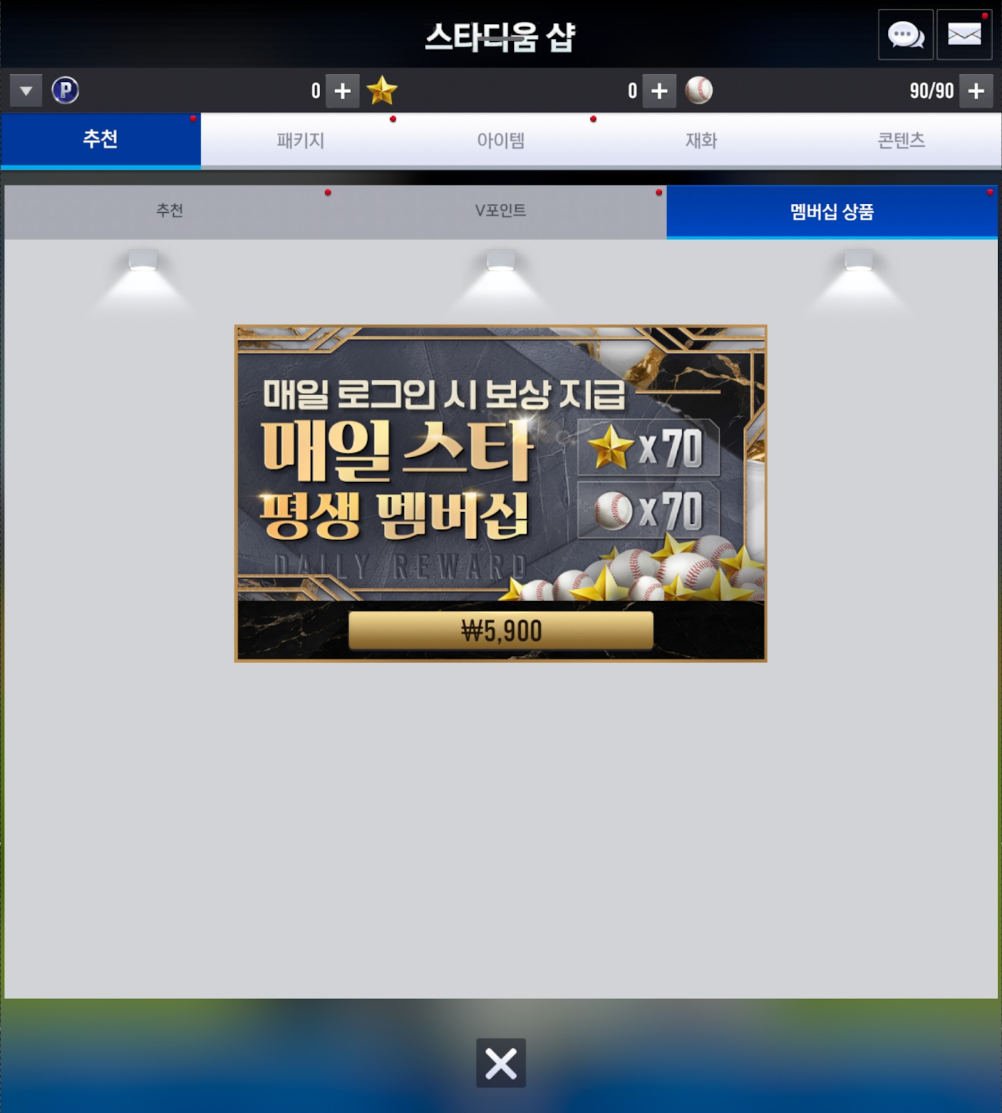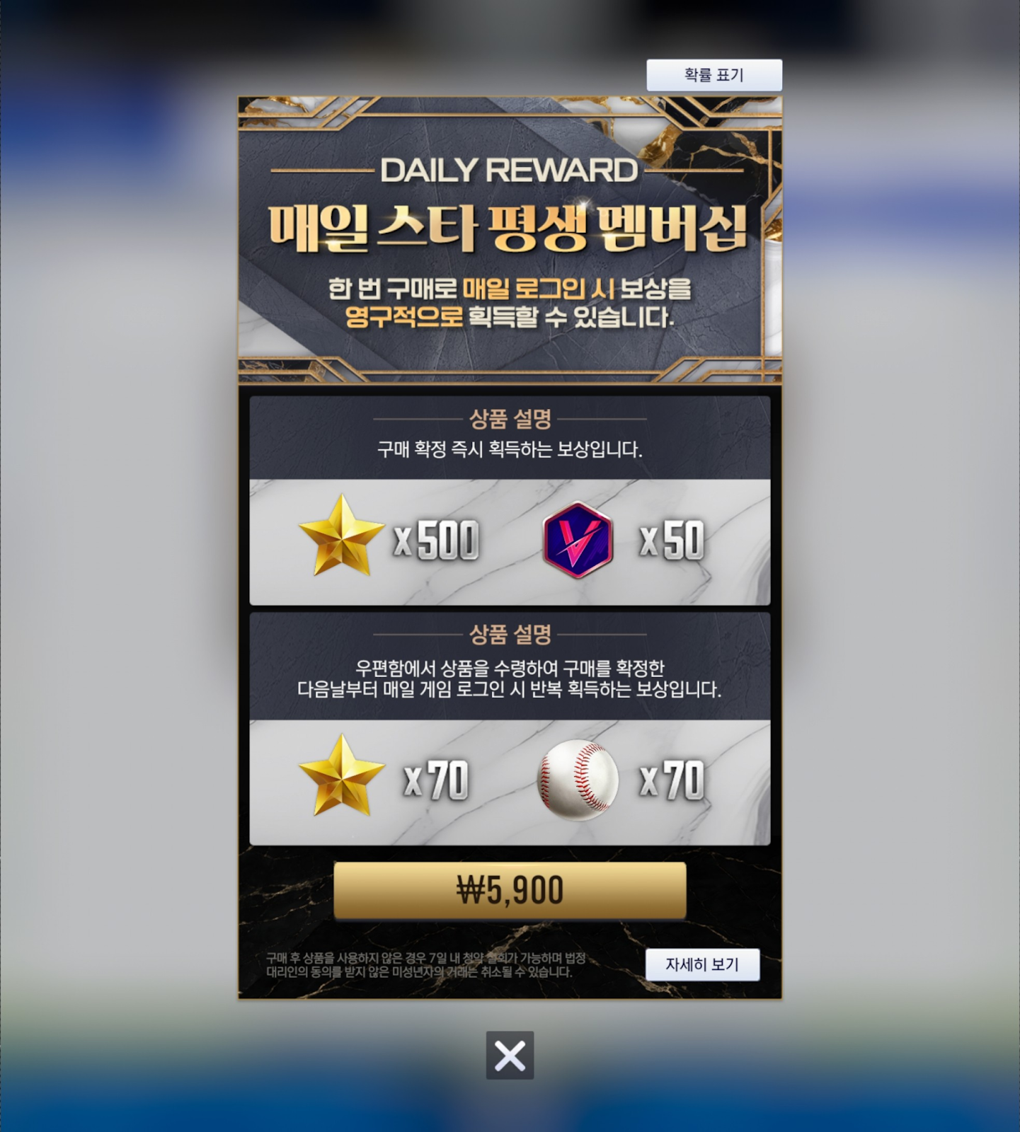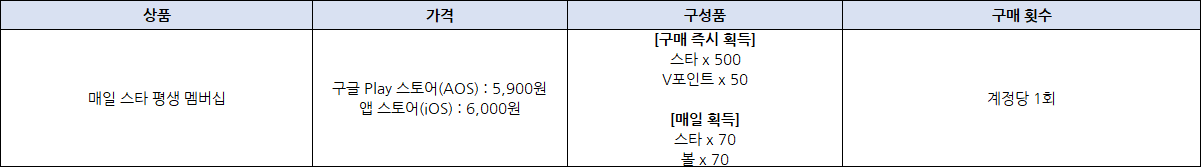 - 멤버십은 별도 종료일 없이 영구적으로 유지되며, 매일 획득 보상(스타 x70, 볼 x70)은 1일 1회 접속 시 마다 수령하실 수 있습니다.