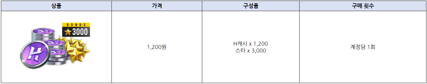 - H캐시 상점에서 ‘H캐시 1,200 + 스타 3,000’ 상품을 한정 특가로 만나보실 수 있습니다.