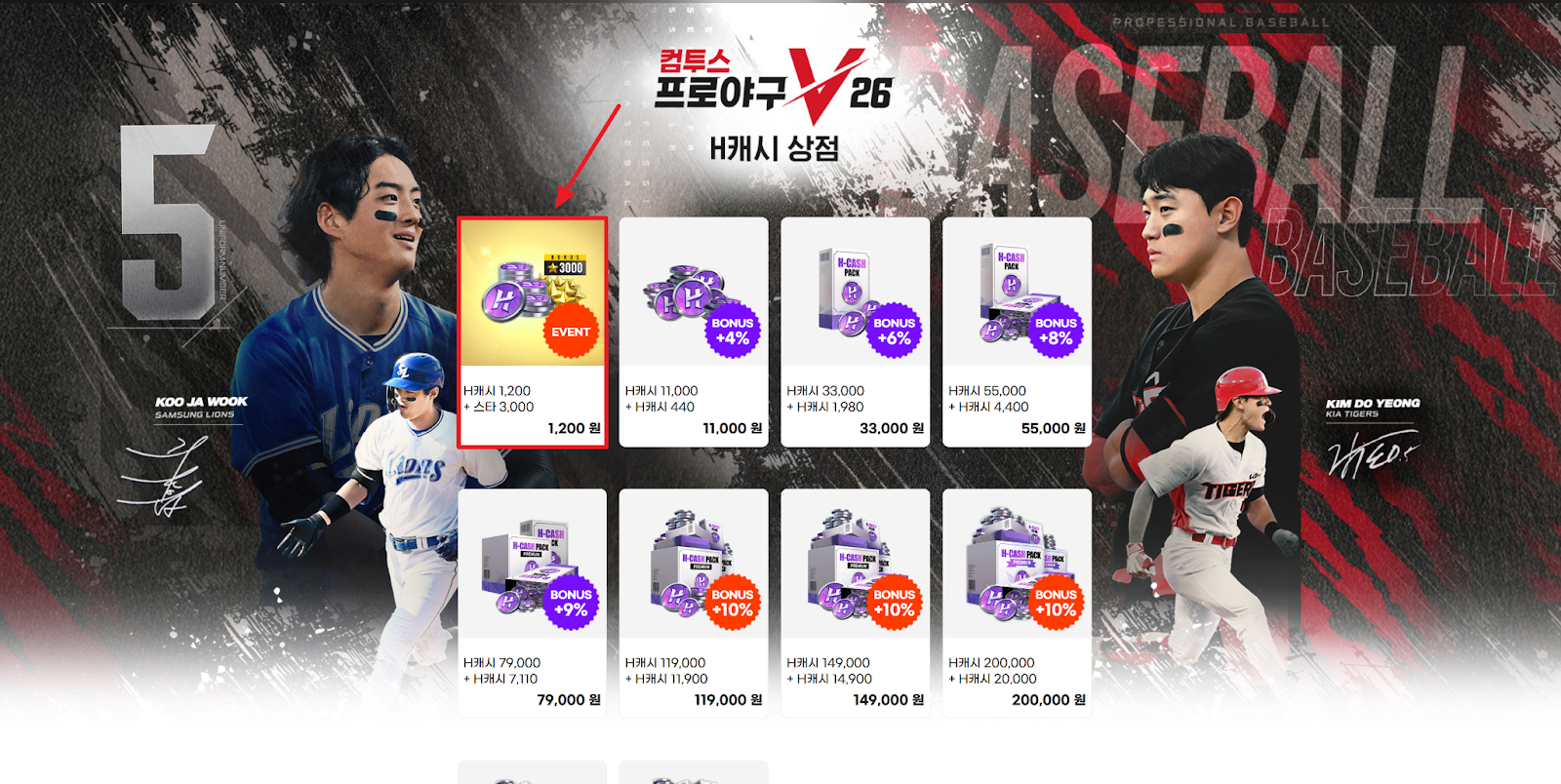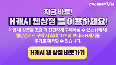- H캐시는 게임 내 상점 상품을 보다 간편하게 구매할 수 있는 컴투스프로야구V26의 재화로,