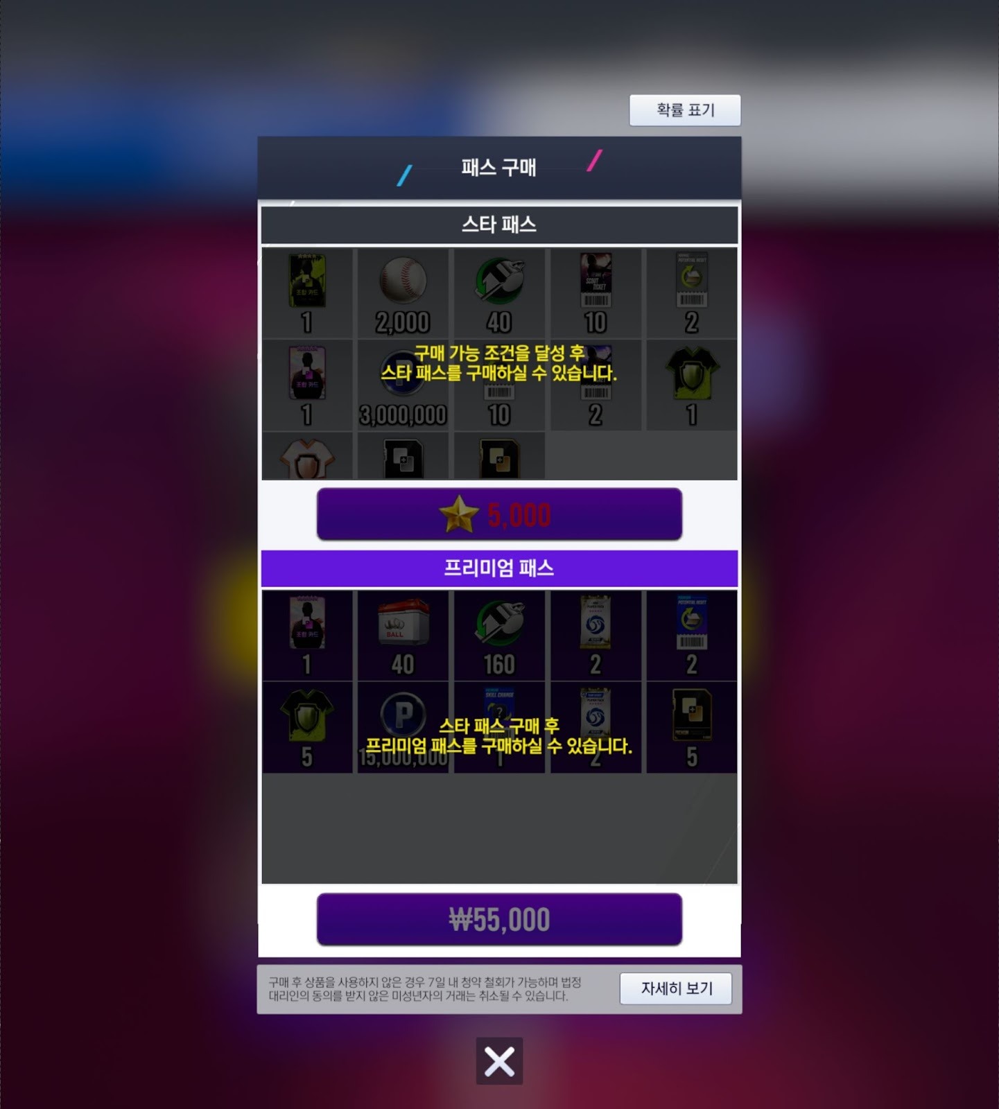 * 구매 시 남은 기간은 60일로 적용됩니다. 이후 누적 하지 못한 단계의 보상은 수령하실 수 없습니다.