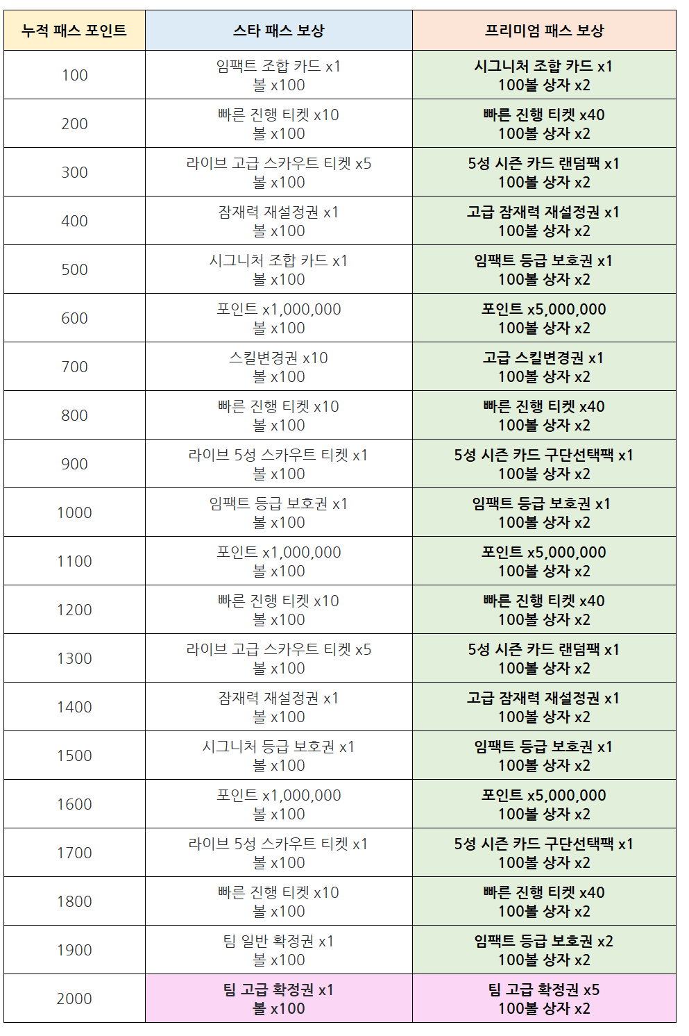 ▶ 누적 패스 포인트에 따라 획득 가능한 보상 리스트