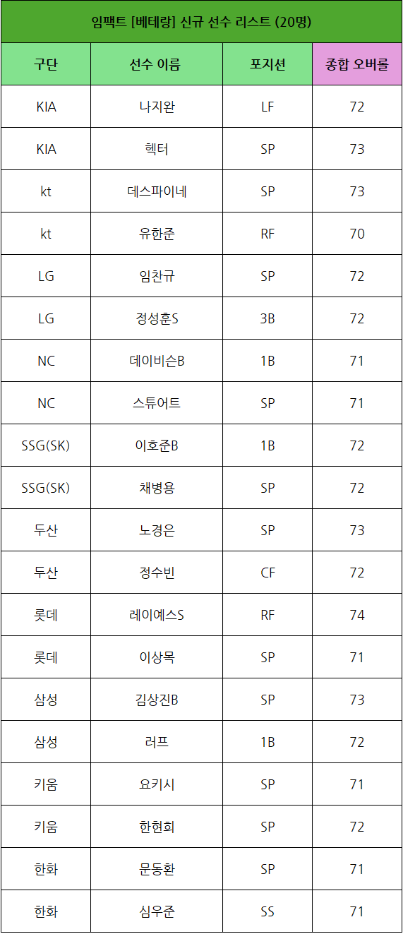- 신규 추가되는 임팩트 선수 카드 명단은 아래와 같습니다.