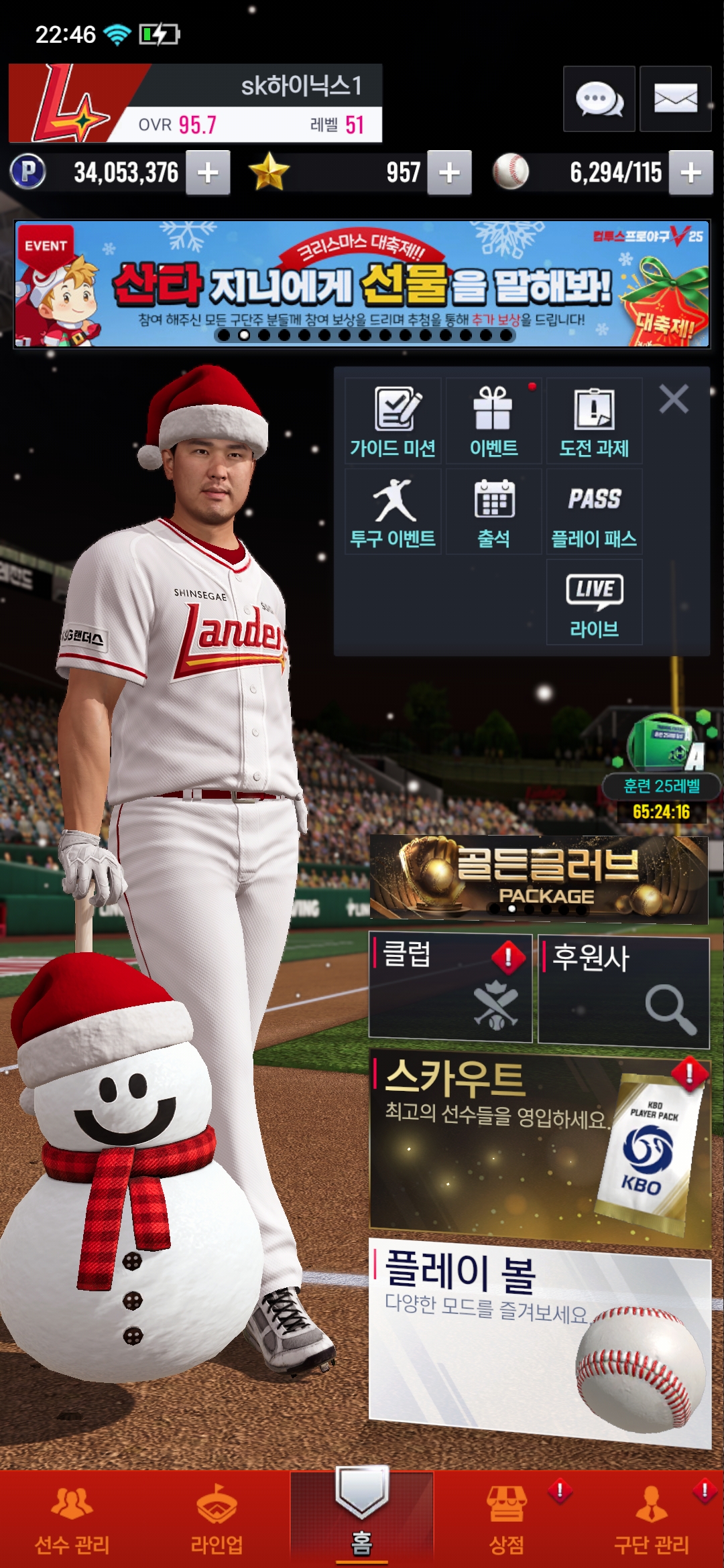 이번에 구단창단 1095이 코앞인 sk하이닉스1 구단주입니다 전 크리스마스 선물,창단일기념1095일 선물 또 1월2일은 저의 생일입니다 전 이게임을 무과금으로 플레이하고 있습니다 하지만 무과금은 포인트가 잘안모아지고 스타, 골글트로피등 현질없이 수금이어려워 OVR 100를 넘지 못하는 상횡입니다 제가 봐도 이 계정은 망했습니다. 하지만 구단 참단일이 1095라는 이유로 이계정을 삭제를못하고 있습니다 제발 OVR 100만 넘을수 있게 (골긍 폰세 아니면 골글선택팩,골글팩)이중에 하나만 있으면 충분합니다.. 산타지니님 항상 힘내시고 감기조심하세요!! 화이팅!