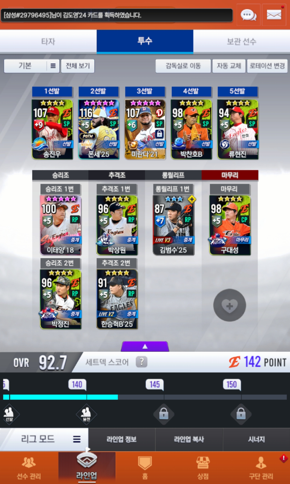 스카우트에서 주는 골글팩에서 21구자욱이 떴는데 문현빈을 잘 쓰고 있는 상황인데 1차교환을 해야할지 아니면 오지환이랑 재조합을 해야할지 모르겠습니다