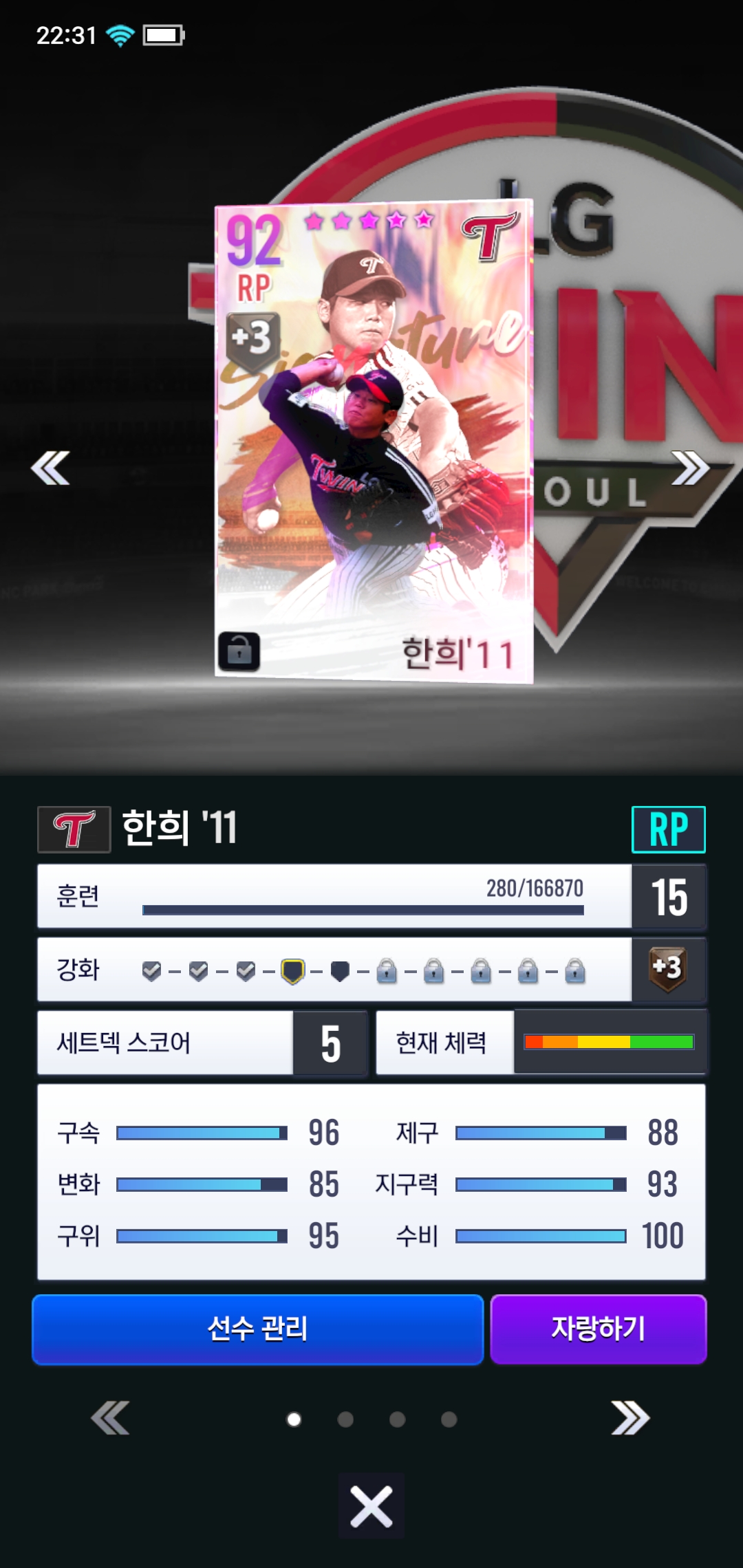 이번에조합에서 11한희를 뽑았는데 스텟은그리좋지않은것같은데 싱커C구종등급때문에쓰는건가요?
