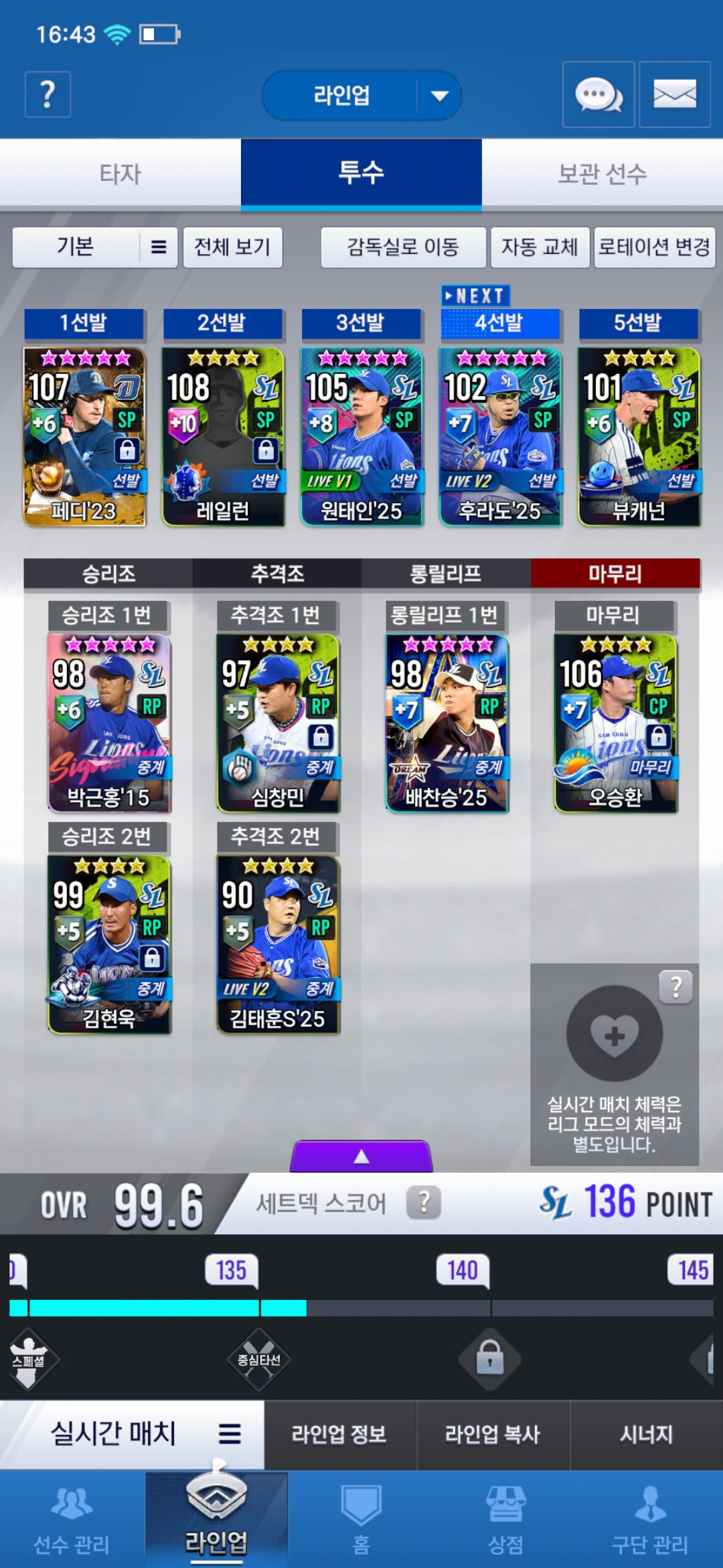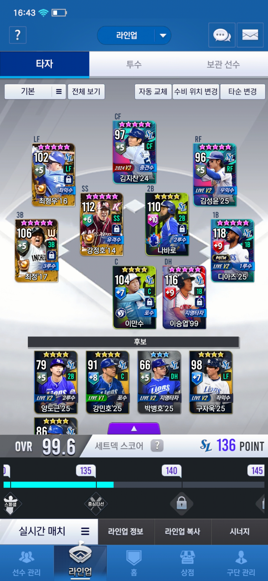 우익수는 시그선택팩받으면 17자욱넣을 예정이고 중견수는 임팩 키플 김성윤있습니다