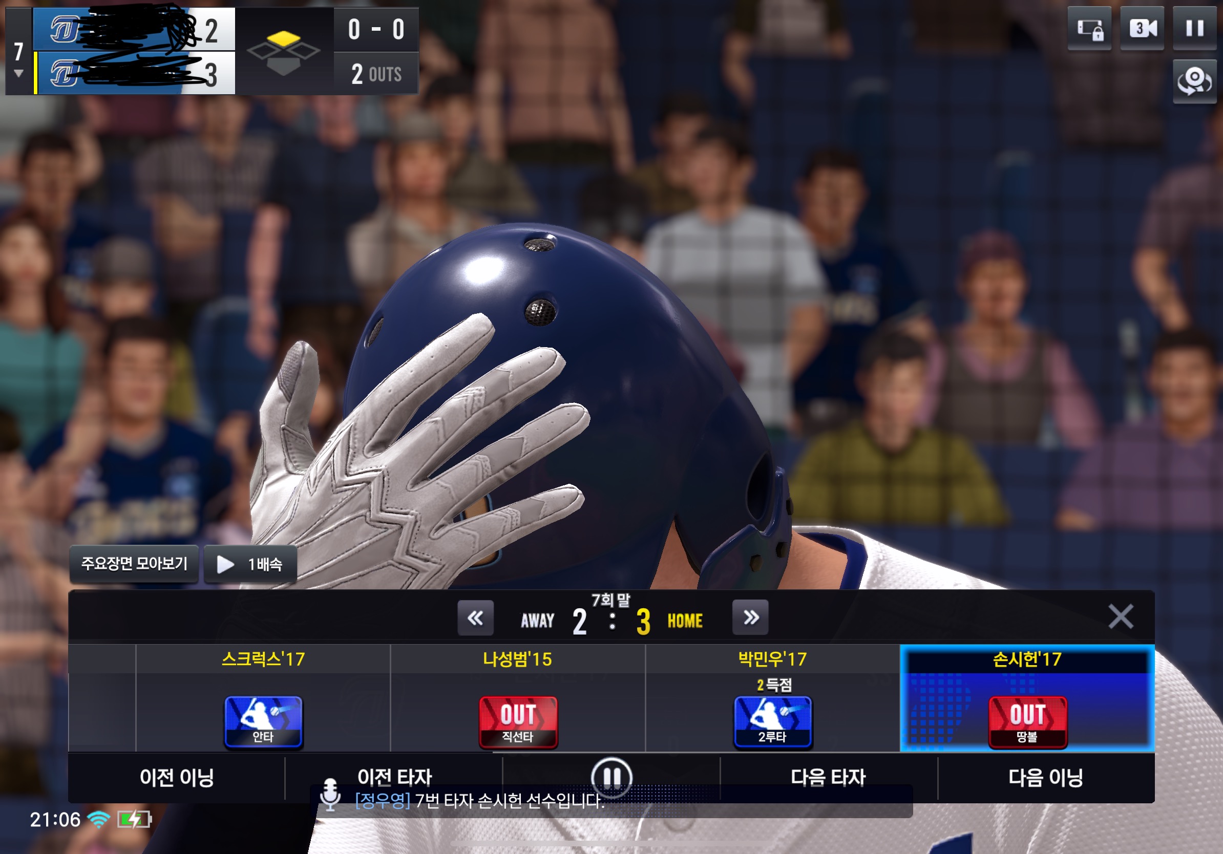 실시간대전에서 박민우가 뜬공아웃으로 3아웃이 되어 7회말이 종료되어야 하는데 박민우의 타구가 뜬공이 아닌 2루타가 되어 2실점이 되었습니다