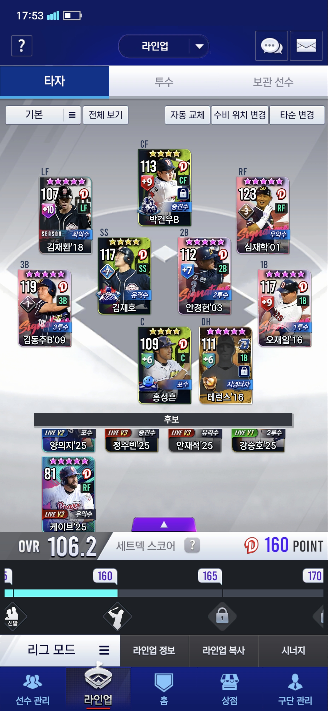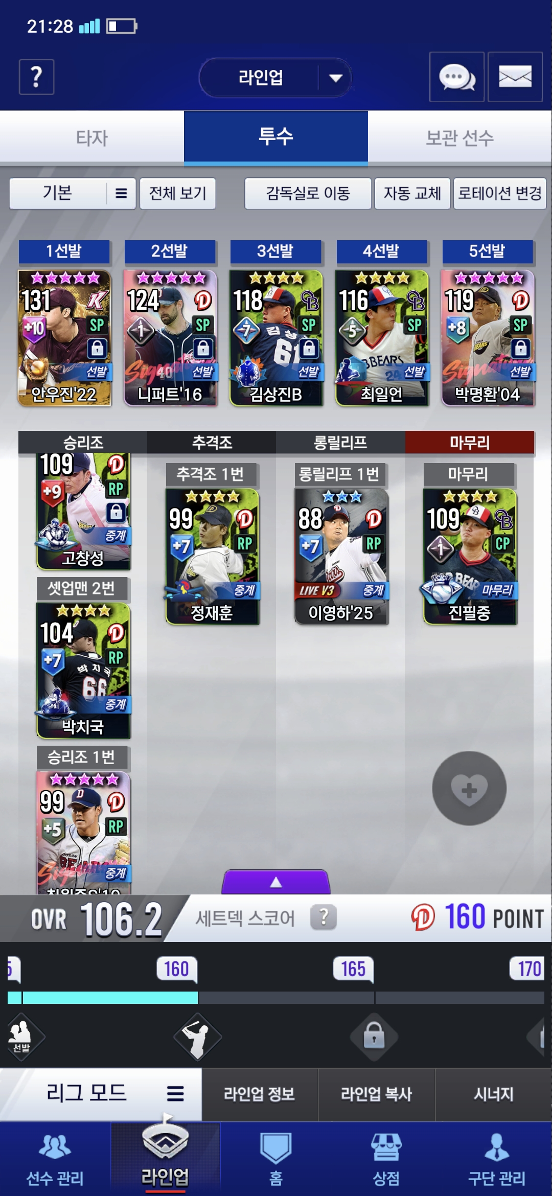 현재 5중계에 이영하 25v3쓰는데 임선팩으로 중계를 먹을까요?아니면 백노 김재호 9각해서 가사재호로 넘길까요?