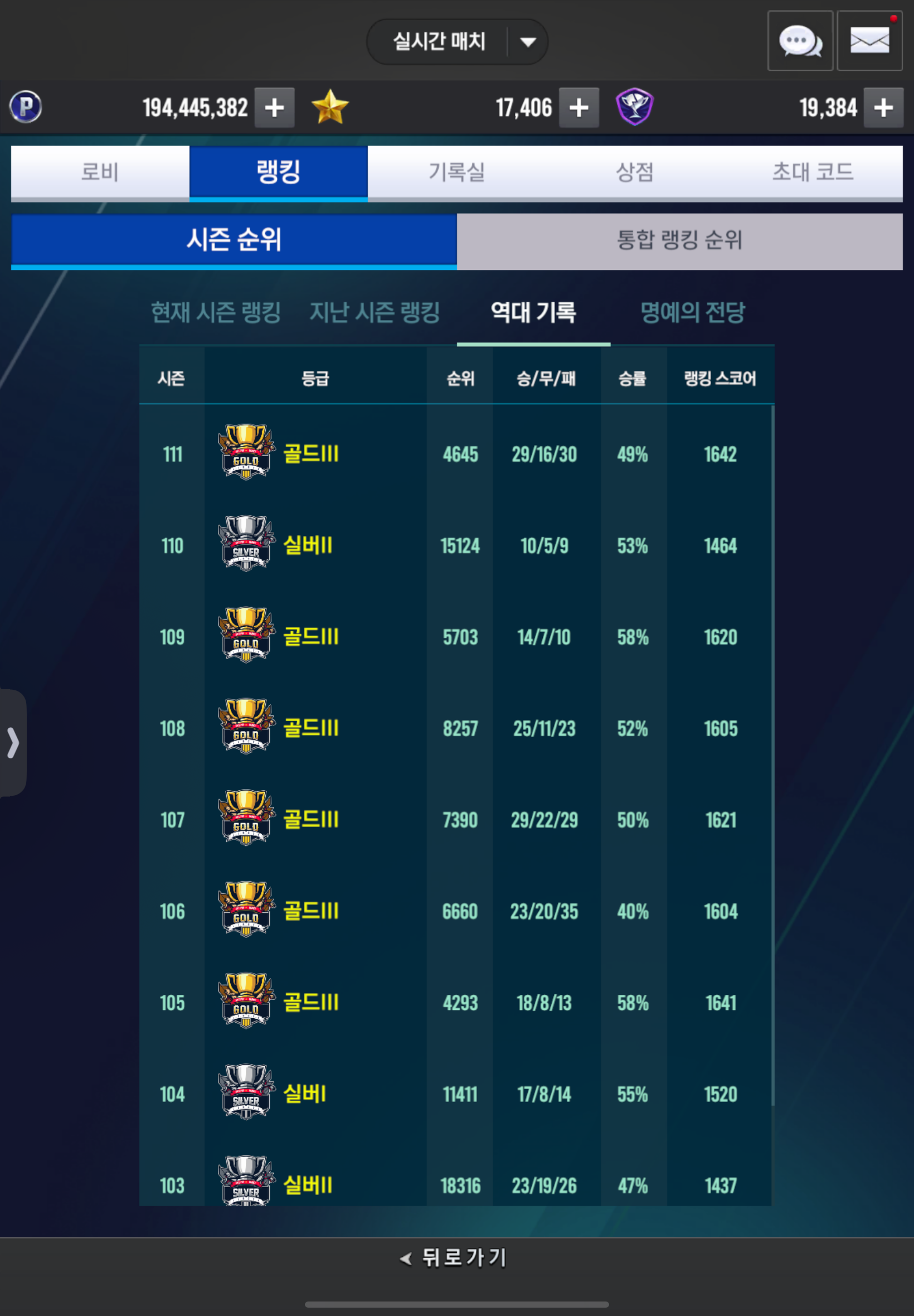 왕족은 오버롤 108 팀을 이끌고 오버롤 120이상의 유저들을 수십차례 상대하면서 (상위 오버롤)