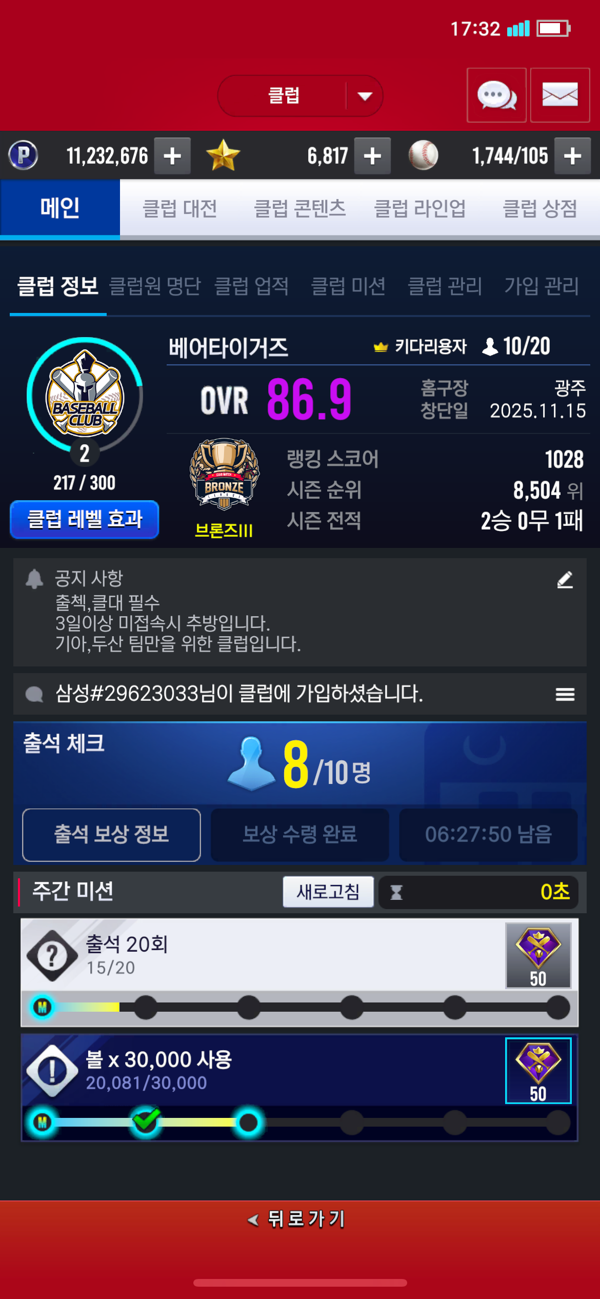 현재 계속해서 저 뿐만 아니라 클럽원들도 열심히 성장하고있고 2~3일에 평균OVR 1씩 오르고 있습니다