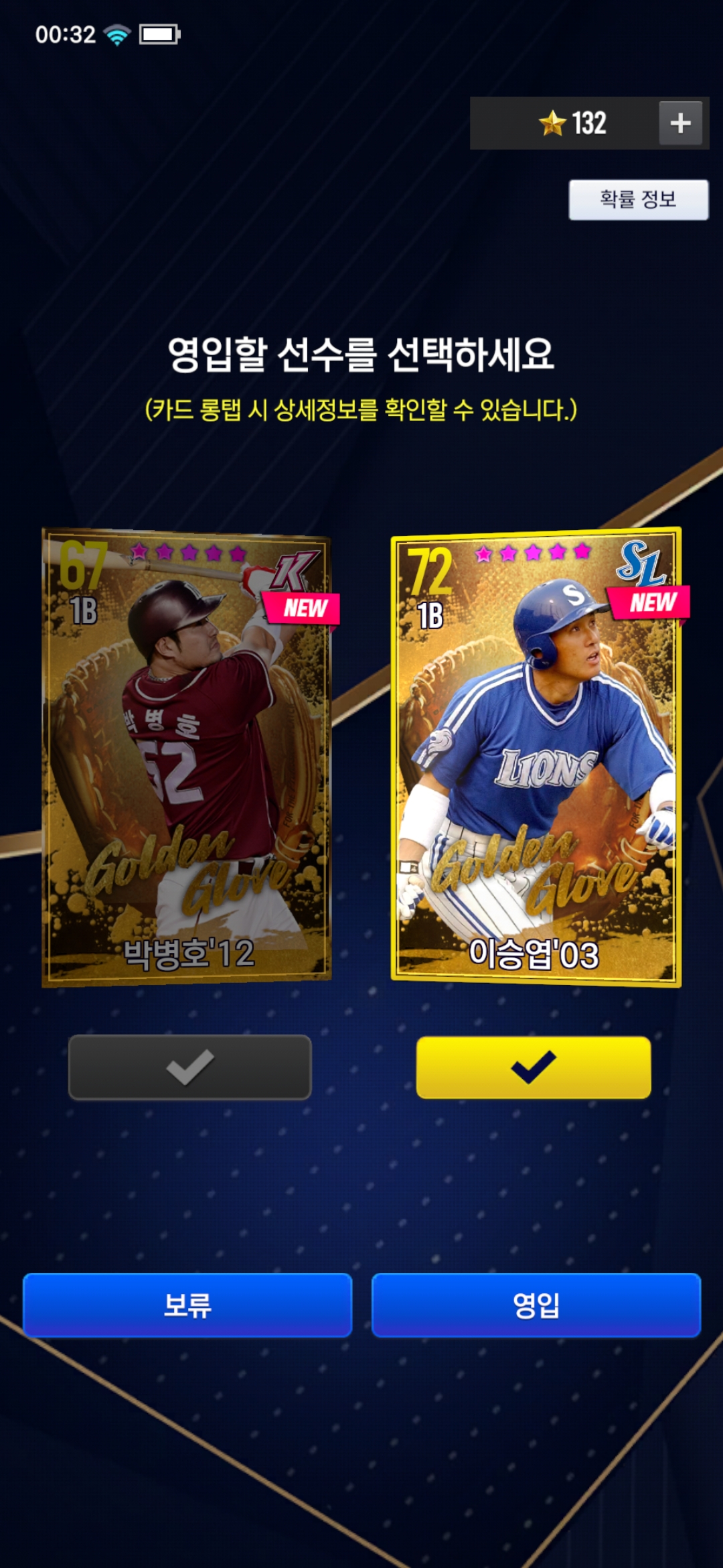 시작한지 얼마 안된 뉴비라 계정 한정 2회만 뽑았는데 둘 다 못쓰는 카드라 바로 재영입을 했는데 아시아 최다 홈런 승엽신 강림!