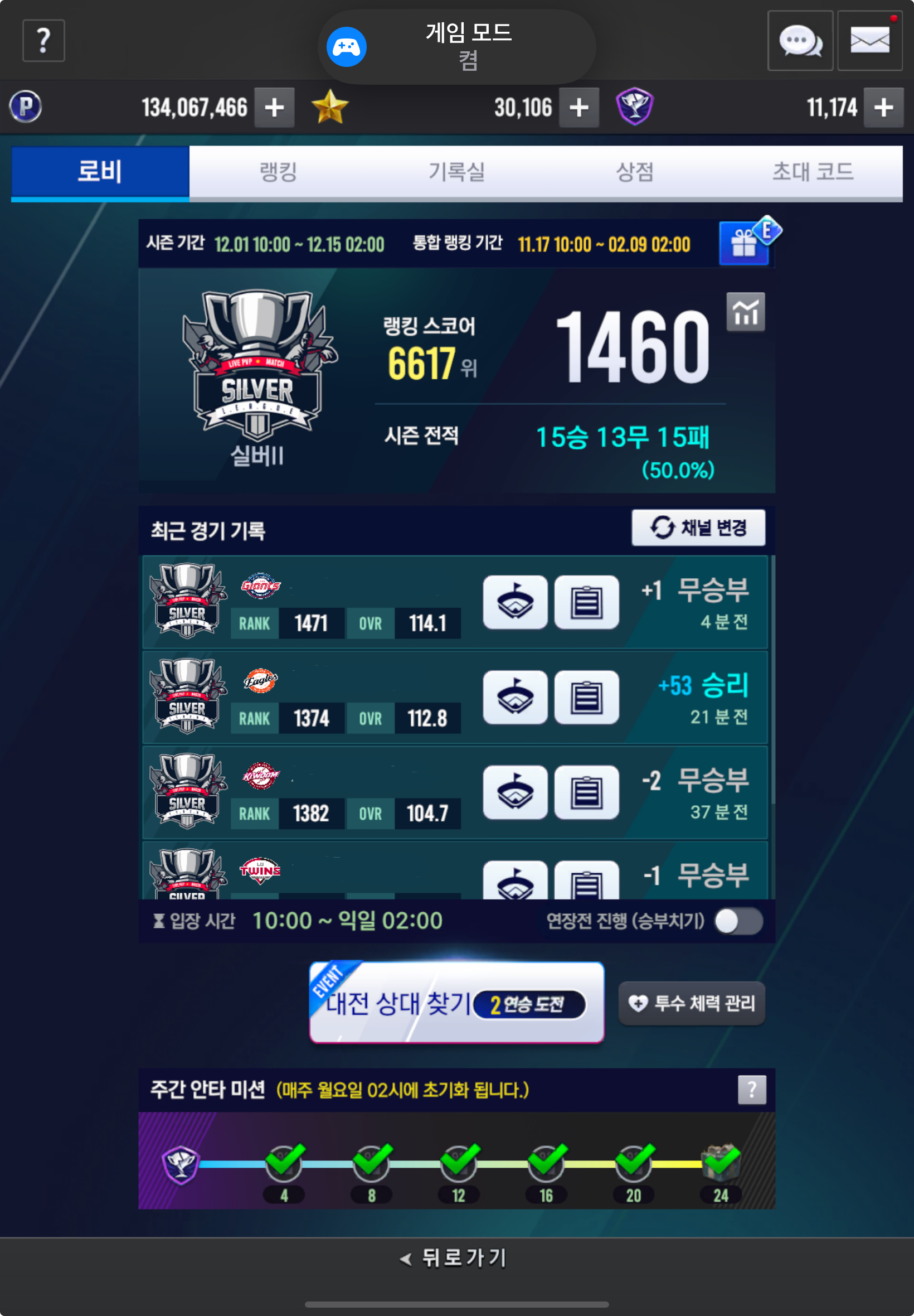 오늘 실대 11판해서 2번 이겼네요