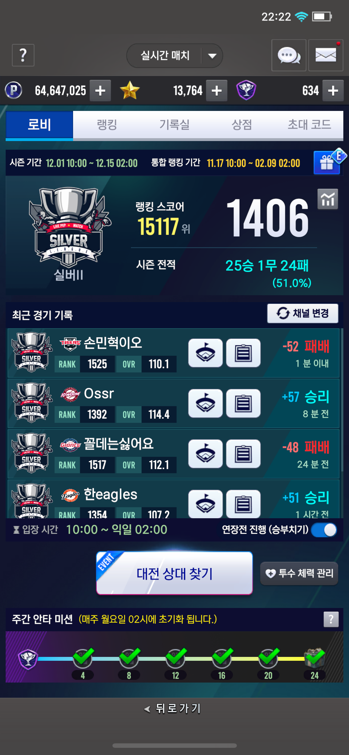 본인 옵롤 105정돈데 1500정도만 찍을라고 돌리는데 뭔 1400에서 옵롤 10차이나는거 이악물고 꾸역꾸역 잡으니까 다음판은 어디 이것도 이겨보라고 더 높은 새끼를 데려오네 진짜 시스템을 언더독만나면 점수 감소를 줄이던가 보상 그거 이겨야지 쥐똥만큼 더 주고 생색내는거 진짜 개 열받네 하 진짜 못해먹겠다 다 선발 9각에 구위 막 140~50이러고 어휴