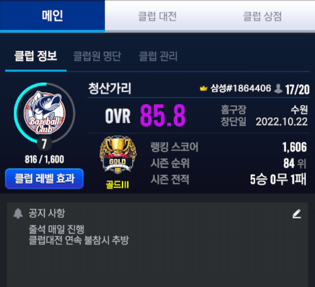 - - 출석, 클럽대전 참여 (연속 불참 X)