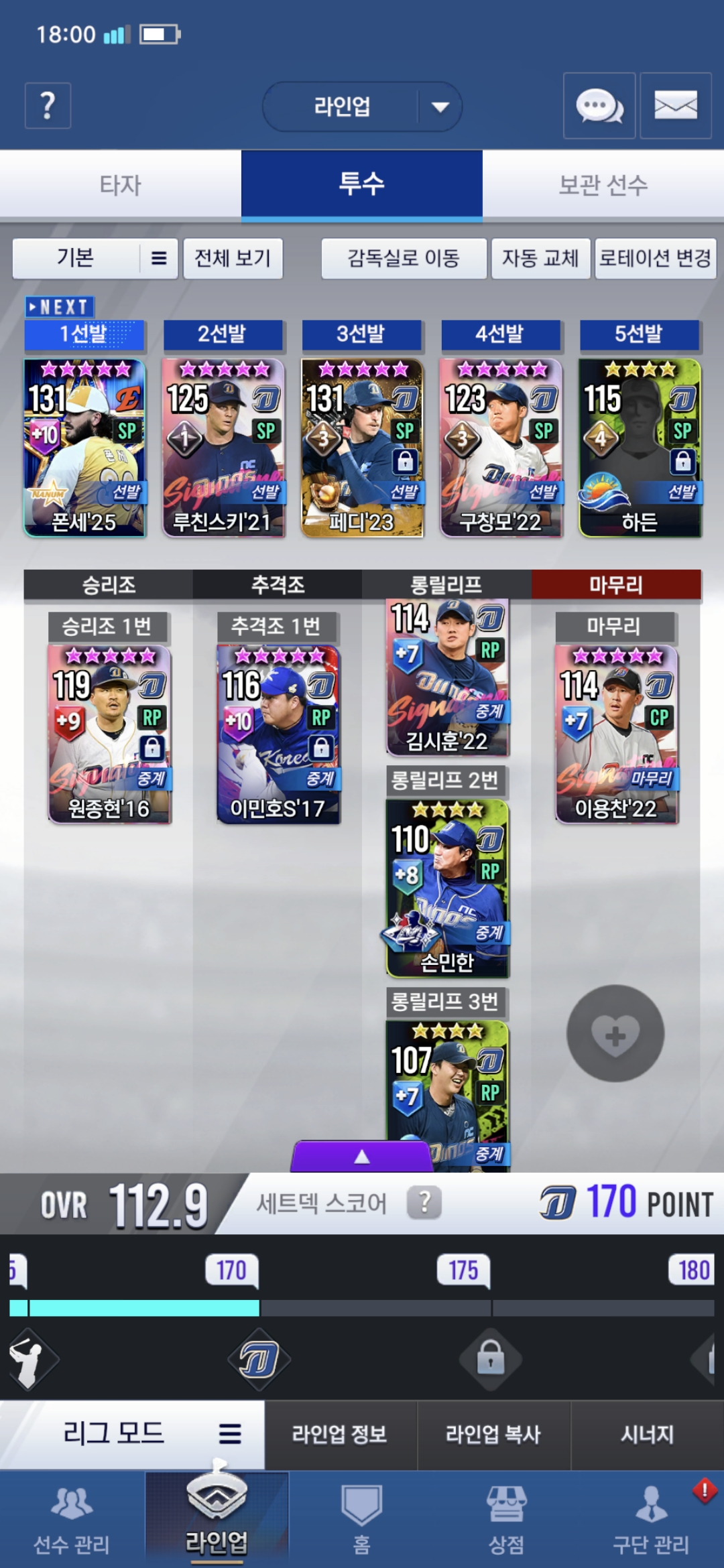 여사 류진욱(현재 6각 가능, 챌코 팩 사서 9각 가능, 추후 마무리 류진욱 나올 가능성 있음, TOP 3 마무리 류진욱 보유 중)