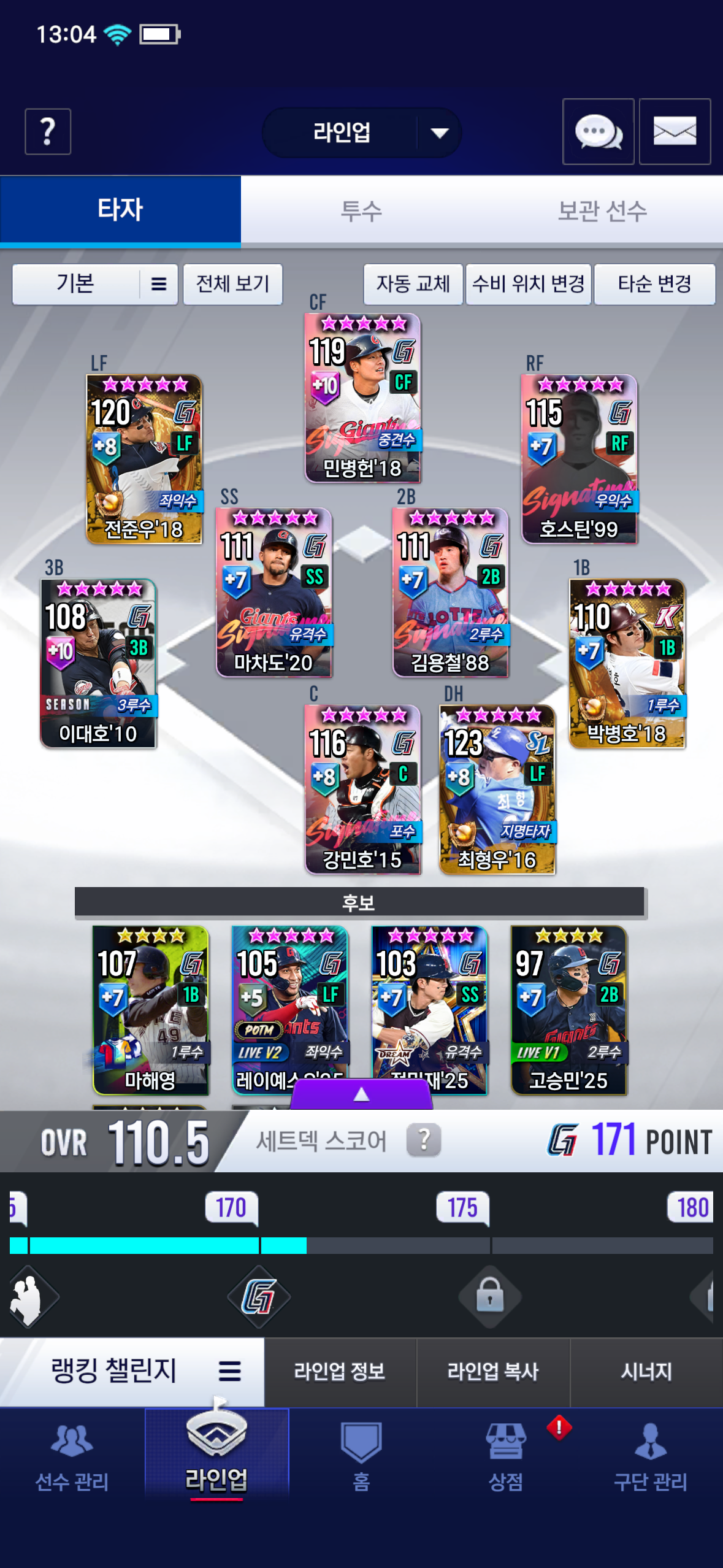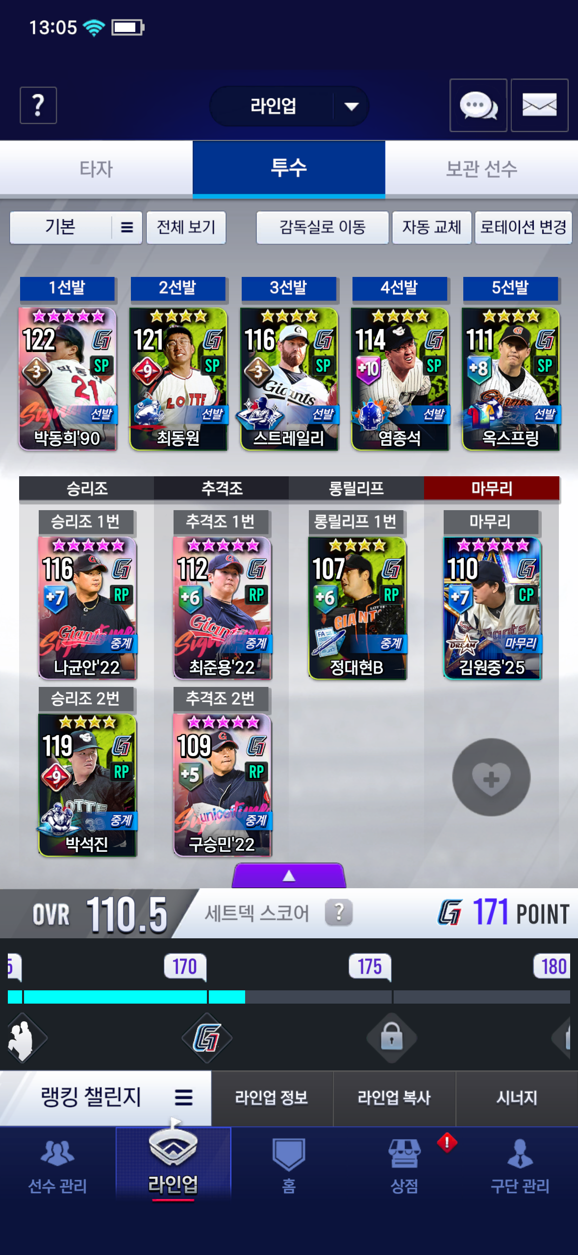 현재 덱 상황이구요 불펜에 여사 강영식 먹어놔서 중간계투로 9각 하고 넘기려고 하고 보관함에 18안치홍 골글도 있습니다 박세웅 같은 선발 임팩 먹을 생각이었는데 혹시 추천해주실만한 선수 있을까요?