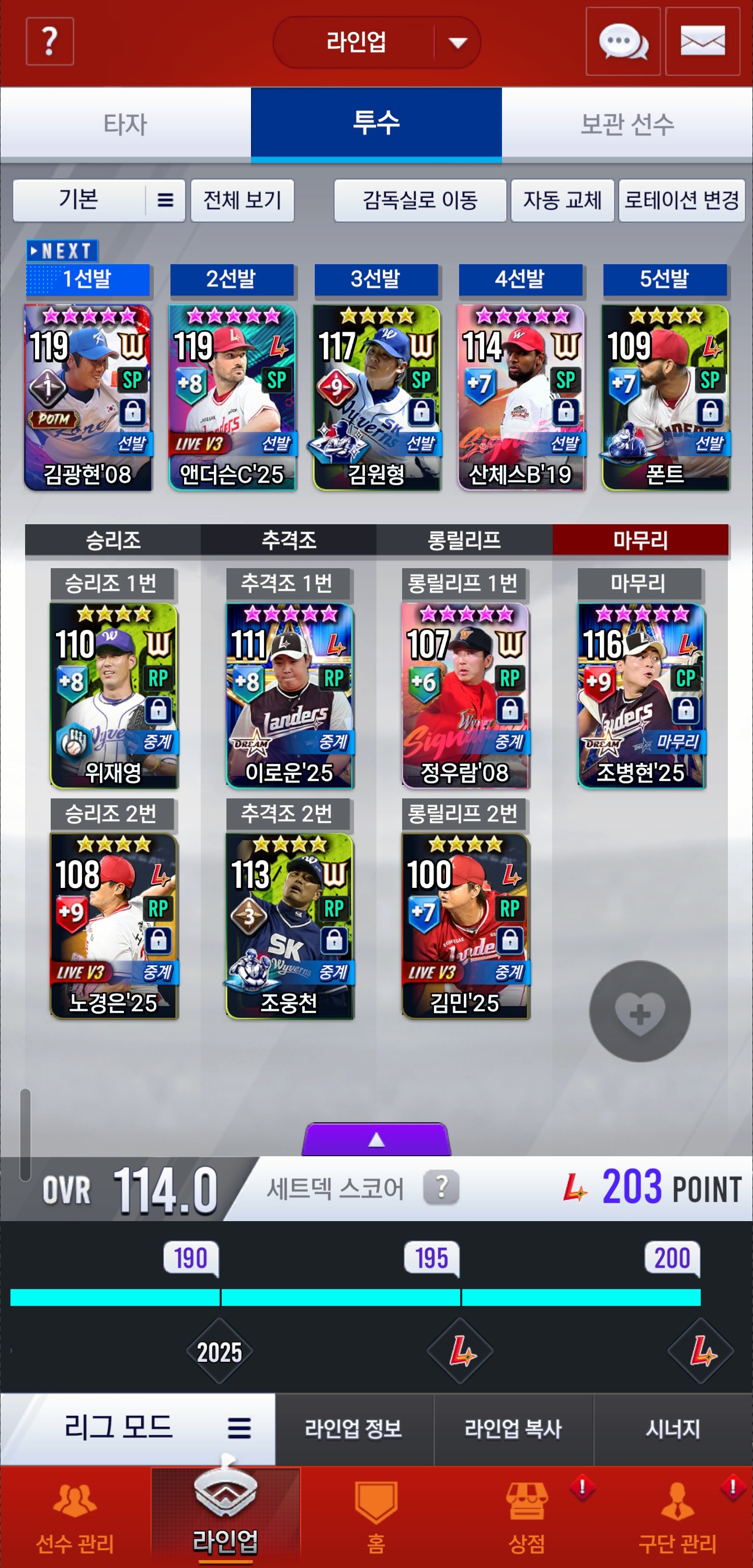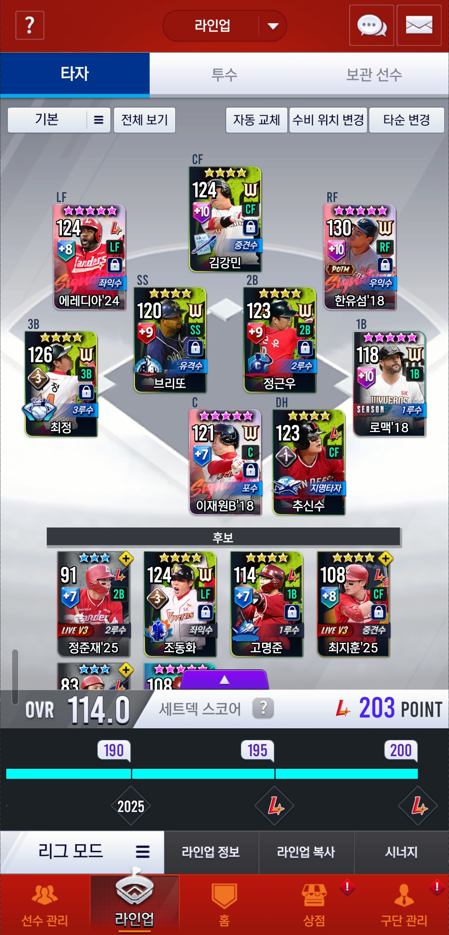 최대한 자팀 위주로 만들고있습니다 앞으로 계획은 곧 대표타자 박성한을 유격수 주전으로 세우고 얼리스타터 최지훈이랑 얼리스타터 조병현을 뽑는 것을 생각하고 있습니다.