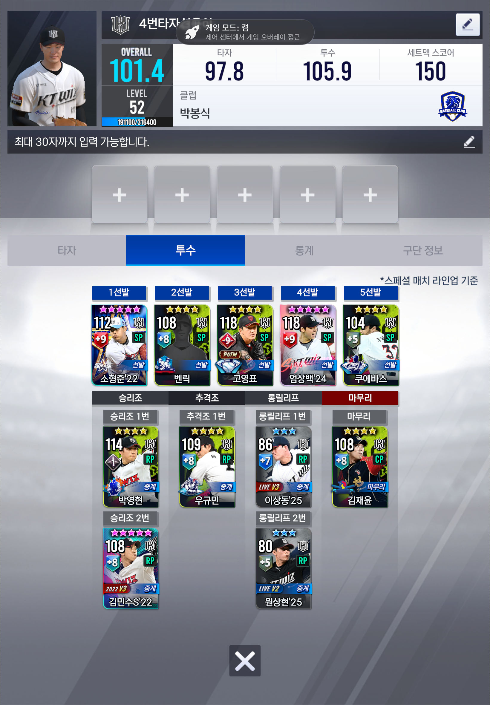 마무리는 여사 박영현 뽑아서 가사 박영현쓰고 김재윤 쓸지 여사 박영현 쓰고 불펜 다른애 기를지 고민중