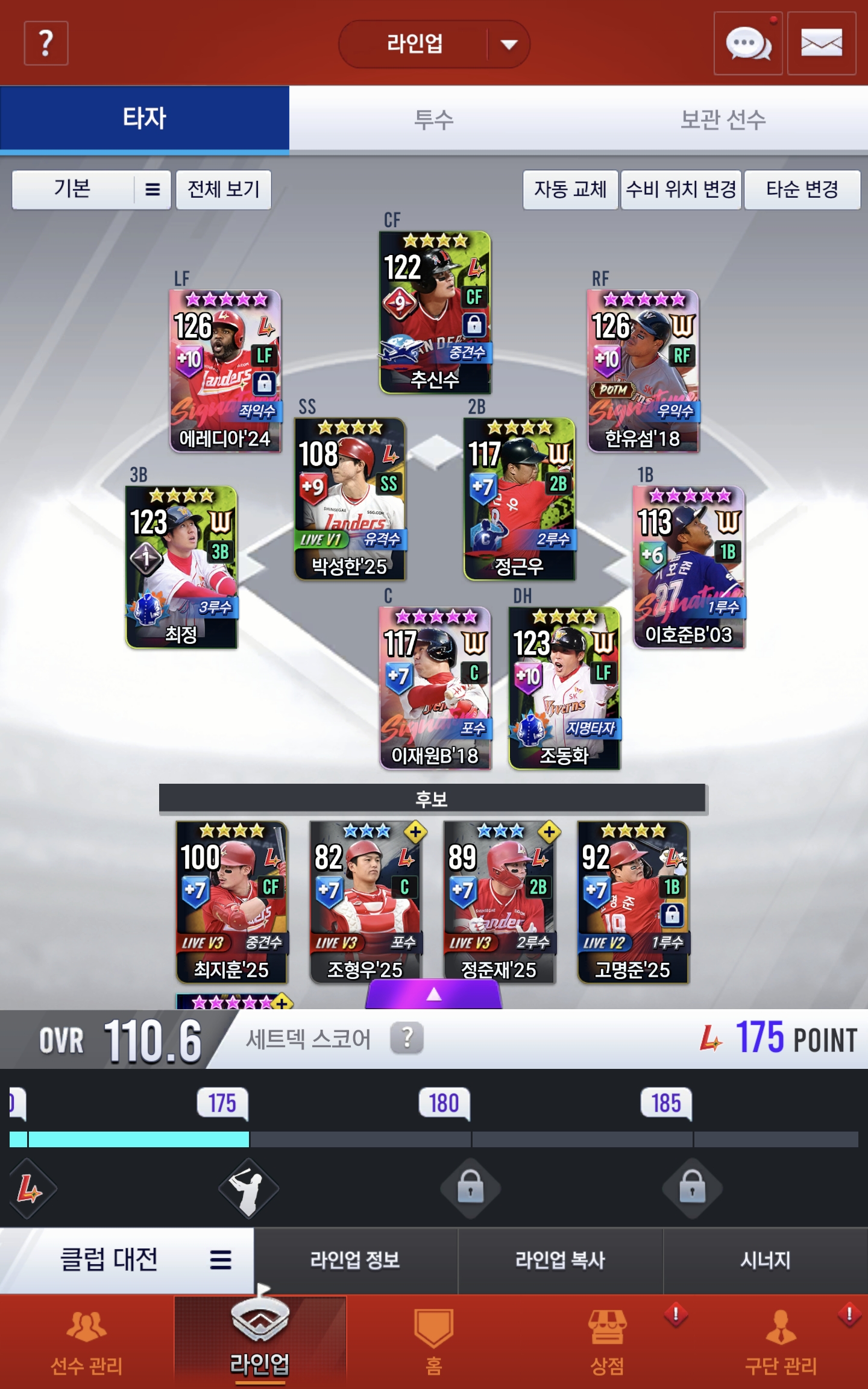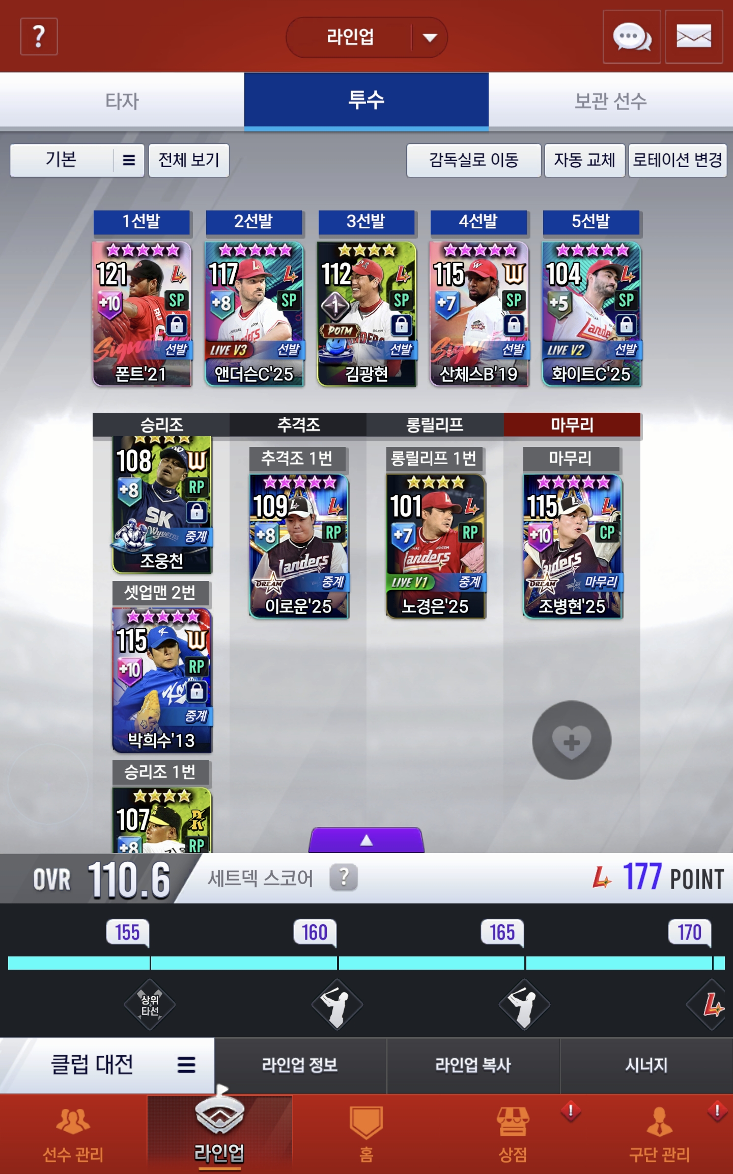 무과금으로 시작한지는 2년 가까이 됐고 제대로 게임한 건 1년 조금 넘었습니다. 보관함에는 골하스 있어서 키우고 조동화랑 바꿀 예정입니다. 훈수 부탁드립니다!