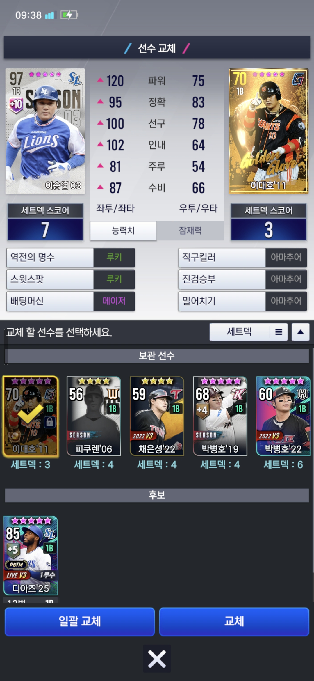 지금 1루수 이승엽 쓰고있는데 이대호로 바꾸는게 좋을까요?