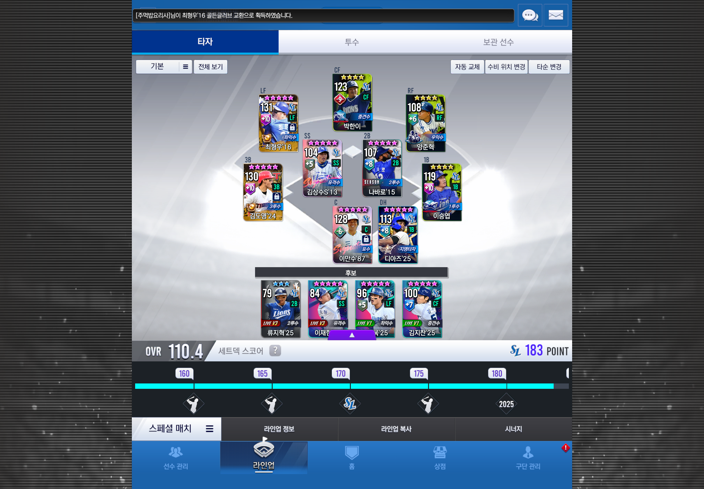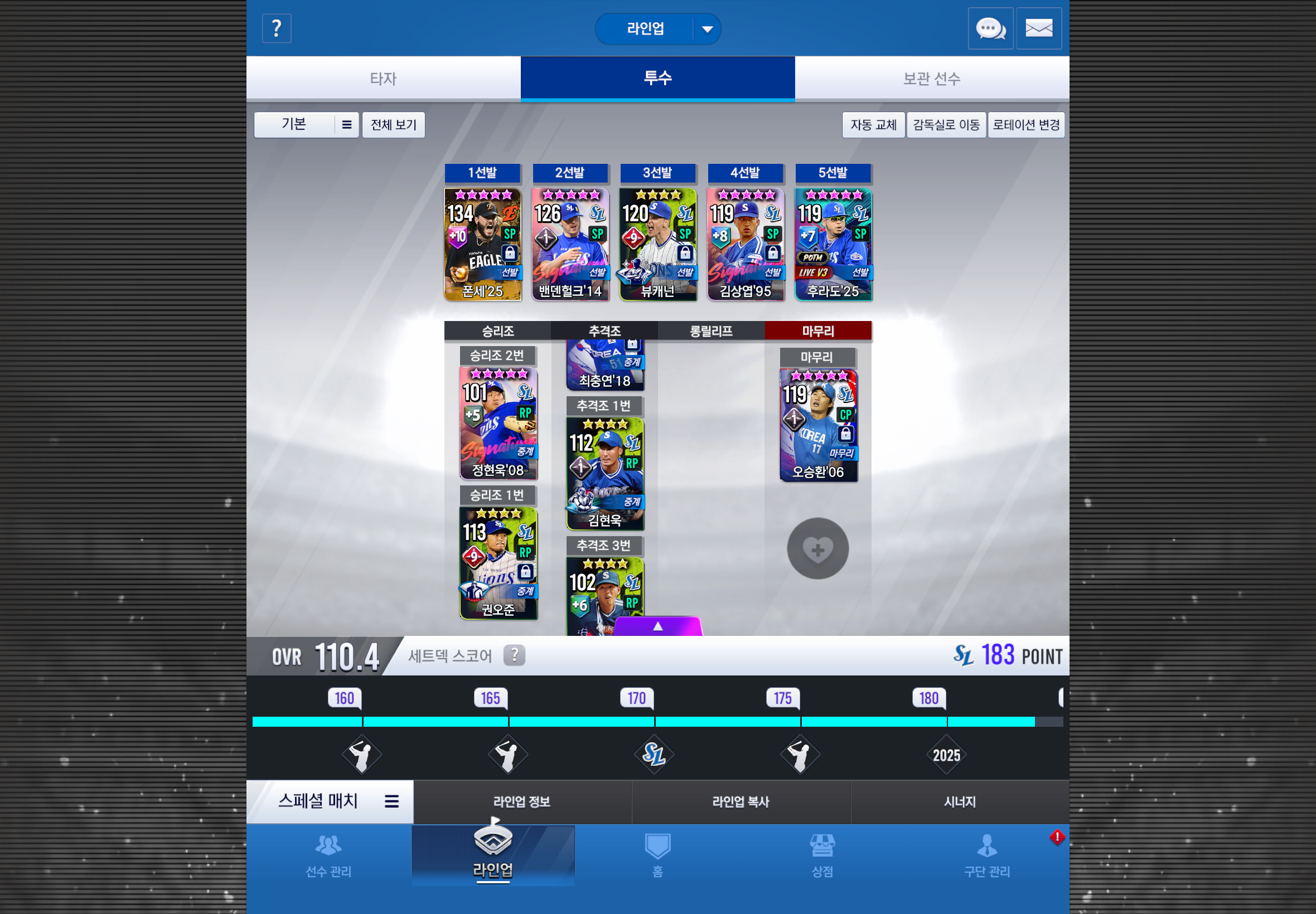 포인트가 딸려서 그러는데 가사 이호성을 먼저 키울까요, 골글 18안치홍을 먼저키울까요 (가려진 불펜은 셋포용으로 라이브 백정현 넣었습니다)