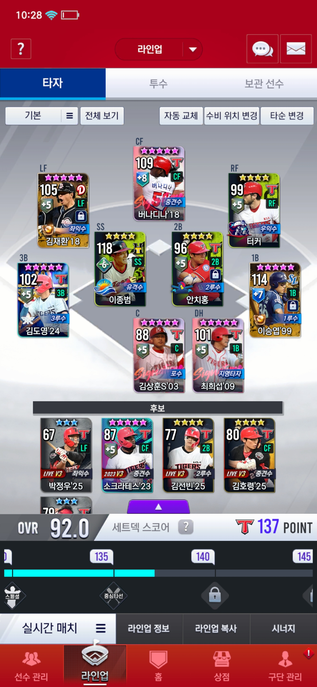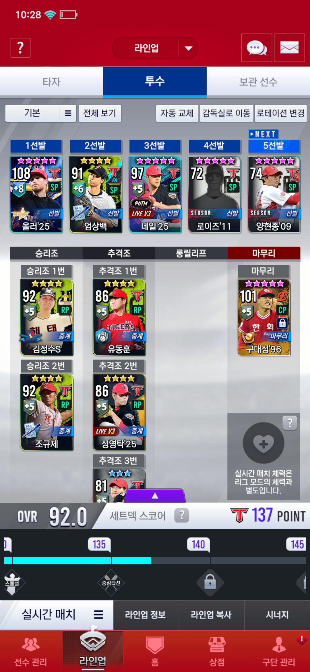 선발 2자리는 골 현종,골 동원 쓰고 있었는데 실대하다가 빡쳐서 재조합 돌렸더니 99승엽 나왔습니다.
