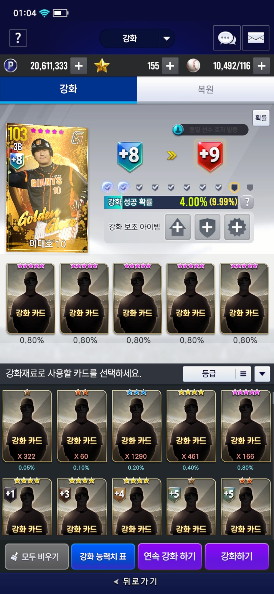 8강 이대호 강화하려고 거의 매번 고급 뱃지 3개 + 5성 1강 이상 강화 카드 or 롯데 강화 카드 썻는데 보정 확률 9.99까지 도달할 동안 한 번을 안 붙더니만 방금 고급 뱃지 2개에 일반 보호 뱃지 하나 넣고 돌리니까 바로 7강으로 터지네요.