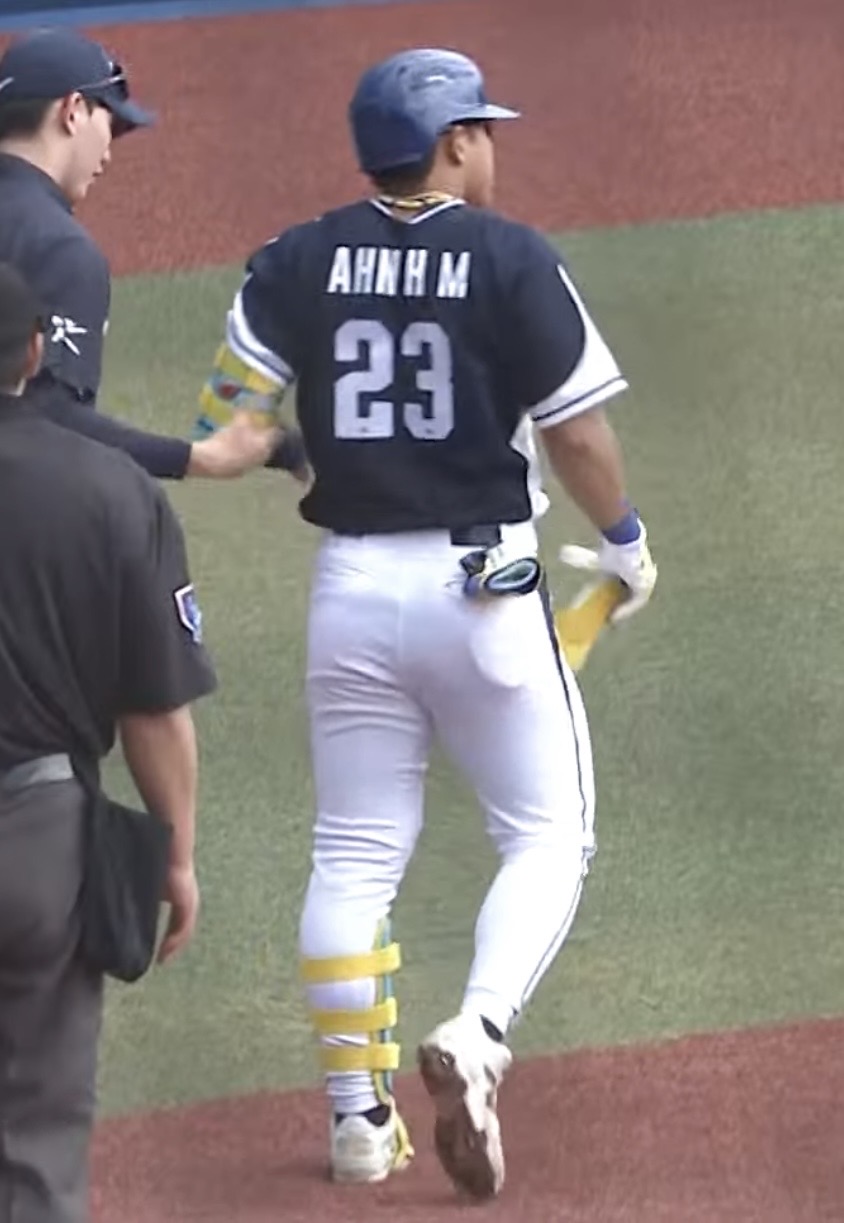 1회 안현민 허벅지로 향하는 빠른 직구 149 정통으로 쎄게 맞았는데