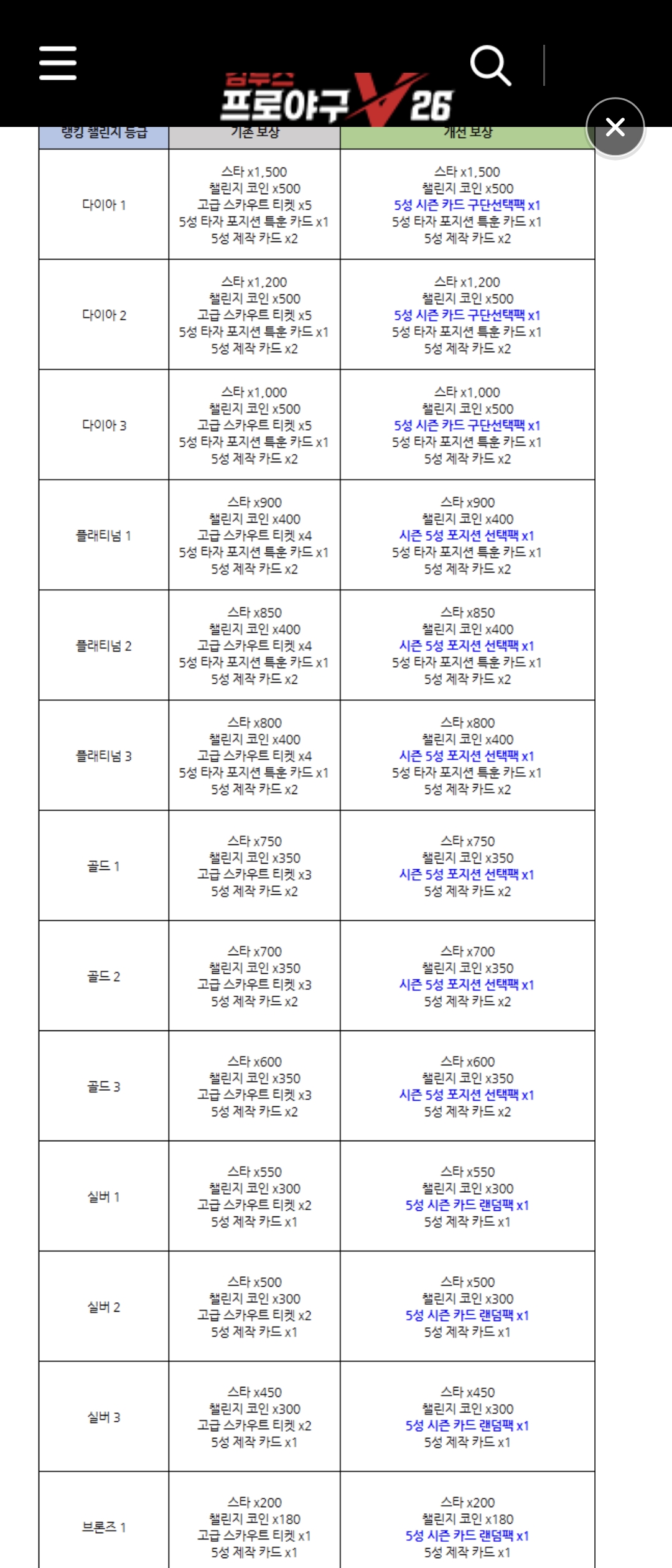 5성 카드 구단선택팩은 라커룸 컨텐츠를 위한것 포지션 선택팩은 포지션특훈을 위한 것으로 보여지는데 현실적으로 다2 상위권정도는 되어야 중계투수까지 포지션 특훈이 끝나있을텐데 챌코 조금 스타 조금 더 먹자고 다이아에 주차할 이유가 없네요 재화 가치 계산을 왜 이렇게 한건지..