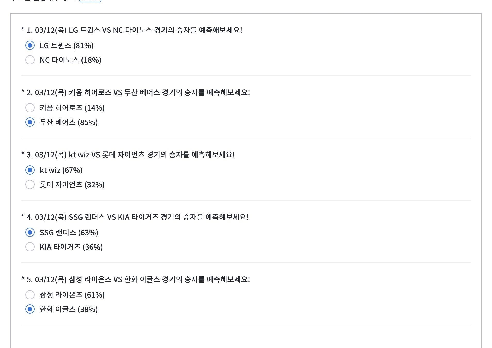 자유 게시판 26 시범경기 왕족의 느낌 왕족 2026-03-12 00:13 138 0 공유 공유 URL 복사 페이스북 왓츠앱 카카오톡 라인 레딧 닫기 공유 KT WIZ 진짜 기대가큽니다. 이강철감독님 화이팅 0 5 댓글 0
