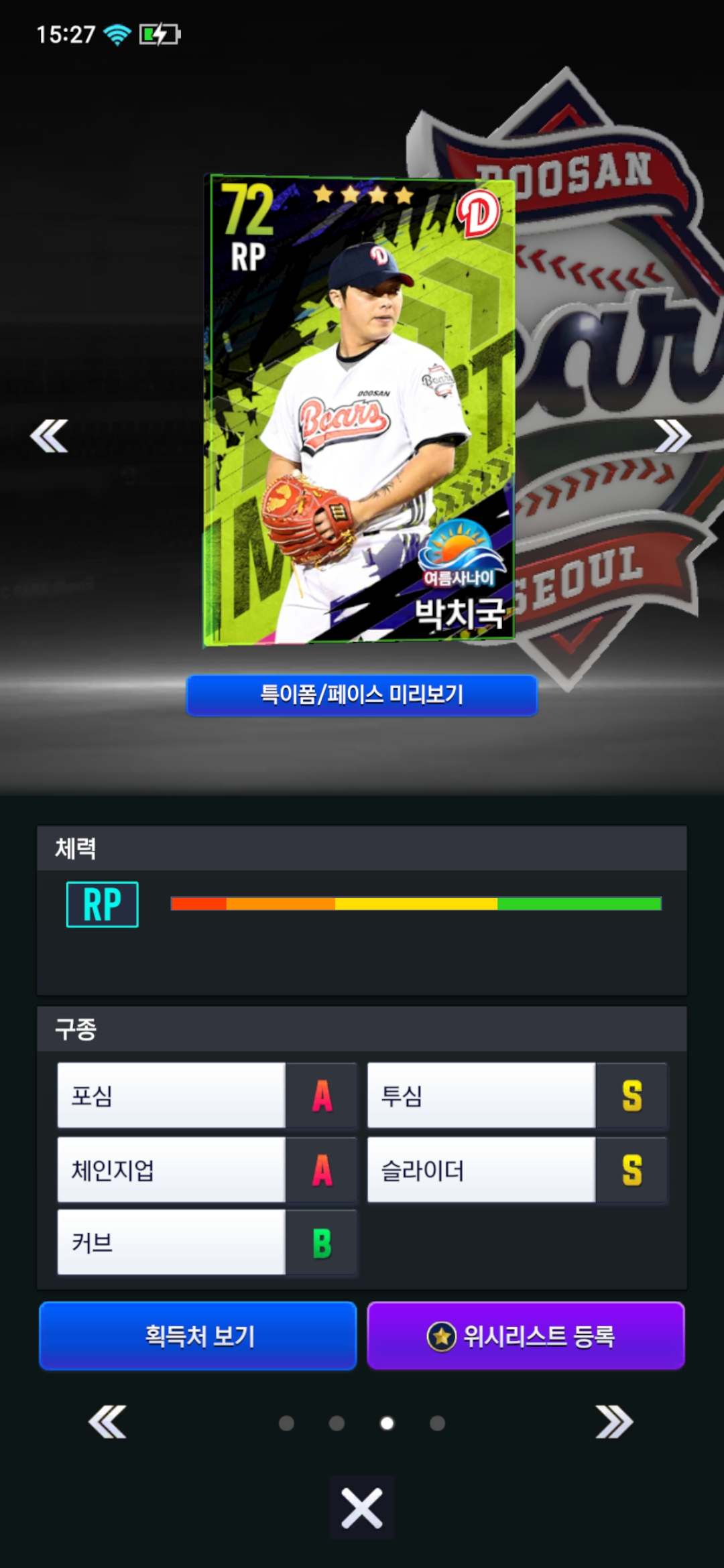 두산 부계에서 불펜 누구있나 구경중이였는데 얘만 구종등급 s있음 왜이럼? 포틈이라기에는 다른 애들은 b a 로 잘 나와있음