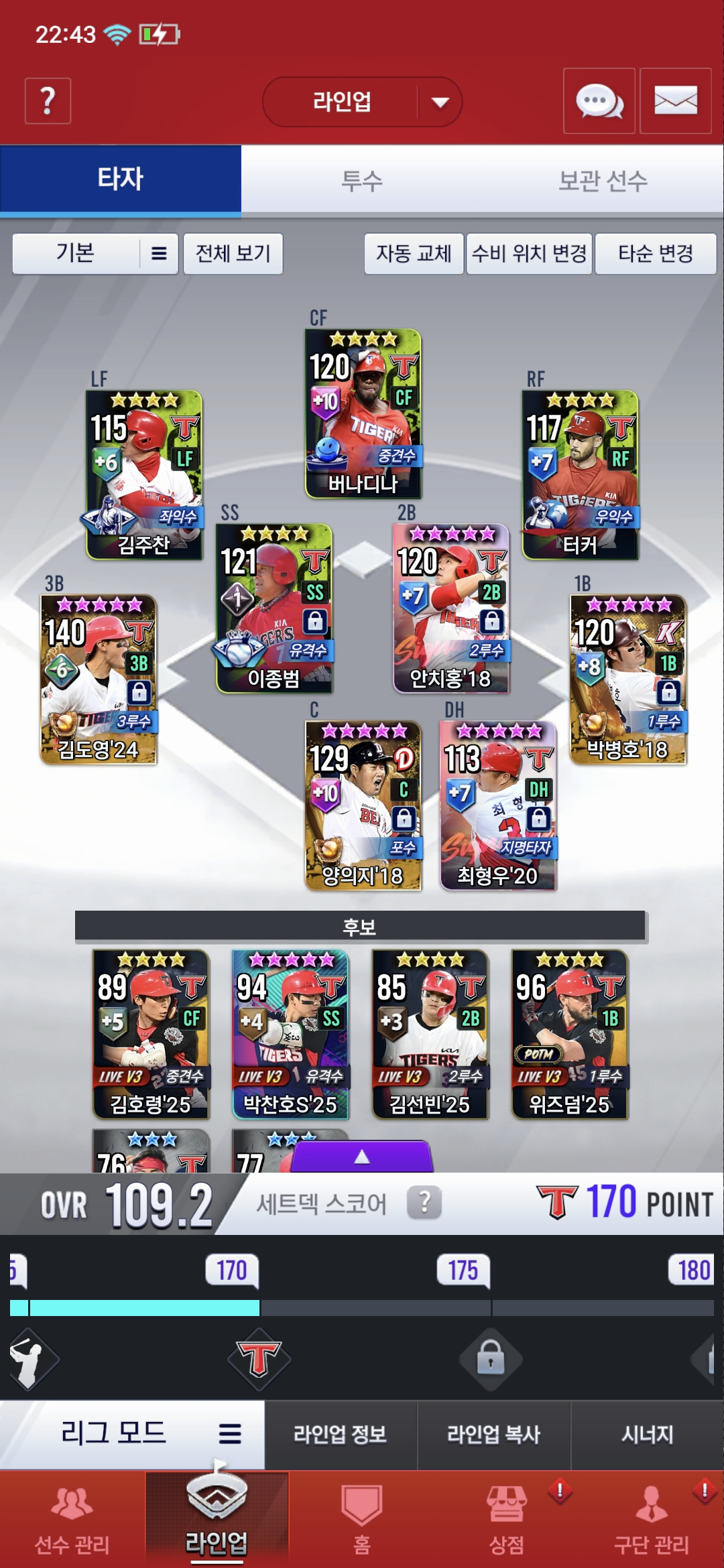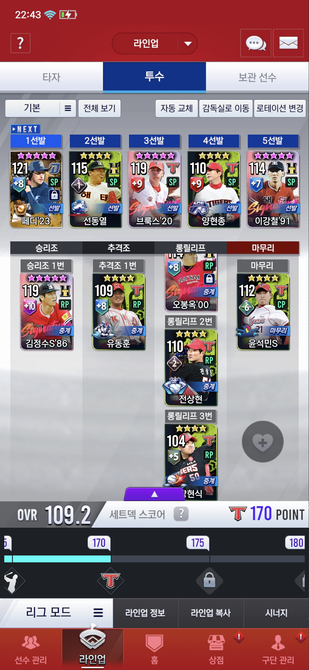 롱릴리프4번은 라이브 성영탁입니다 팀평및 투구이벤트에서 얻은 시선팩 그리고 임선팩 추천해주세요