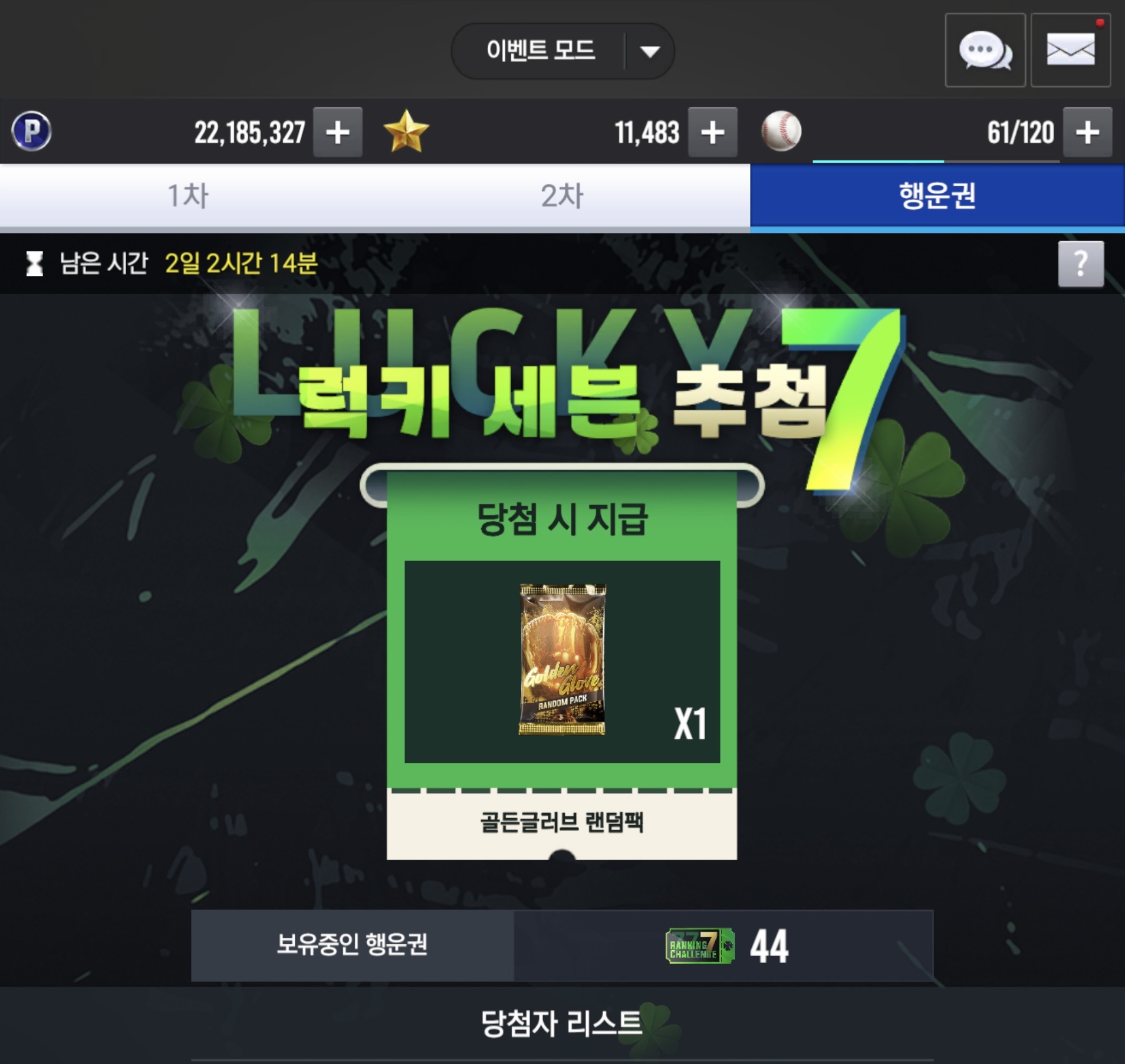 럭키 세븐 “ 골든글러브 랜덤팩 ” 당첨 되었습니다