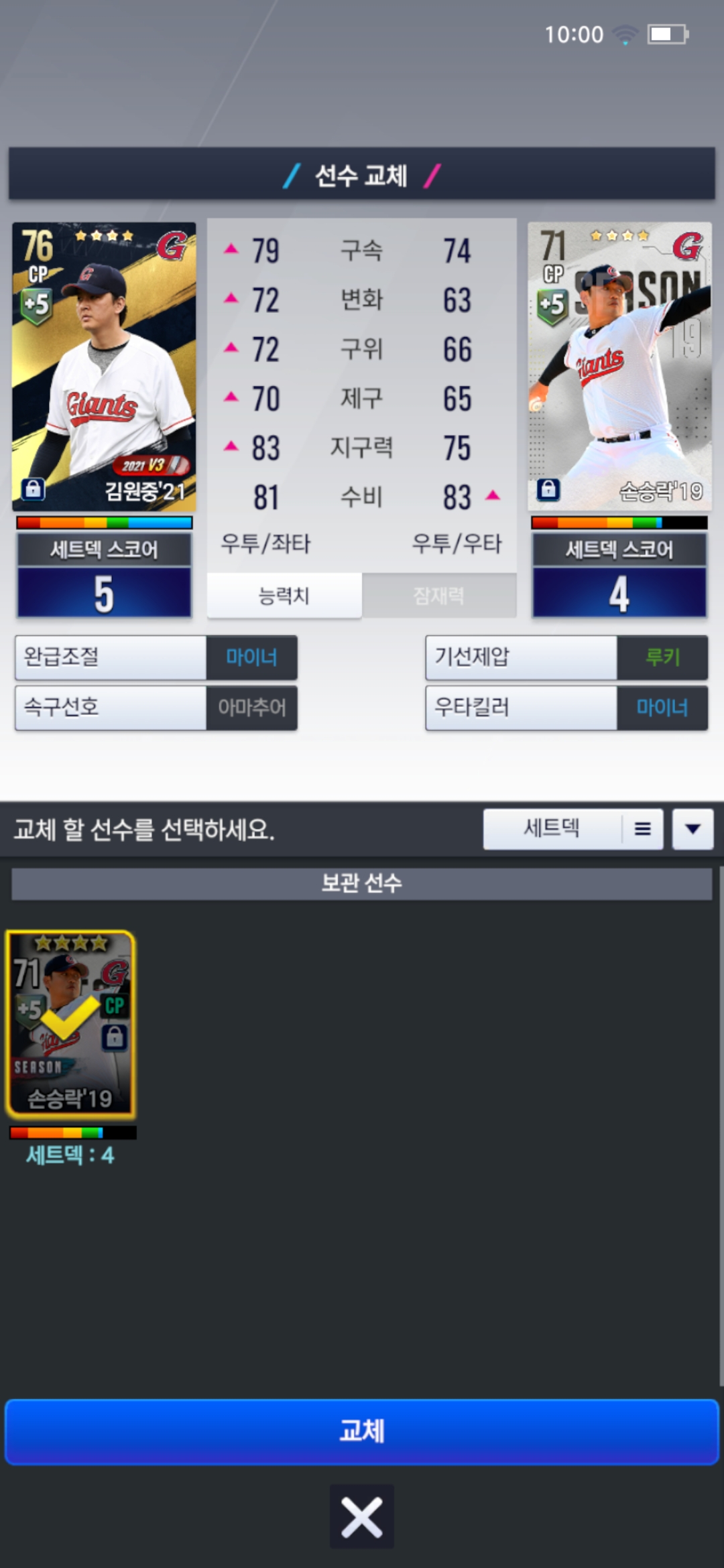 아니면 구종은 많지만 오버롤이 낯은 최근에 얻은 손승락19가 나을까요?
