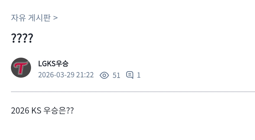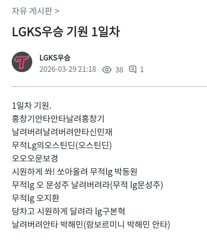 님만 있는게 아니라 모든 야구팬도 있는데 님이 원하는 “네이버 카X” 가 아니에요 여긴 자유 게시판 이지 “그 유저” 처럼 되시지 마시고 적당한 선을 지켜주세요 다른분도 피해를 입고 있는데 적당한 도배는 양심껏 합시다 제발 선은 사람도 있지 양심이 있는데 진짜로 님이 원하는 LG 게시판이 아니고 모든 야구팬도 있습니다 그리고 저도 LG 화이팅 할게요 선은 지켜주세요.