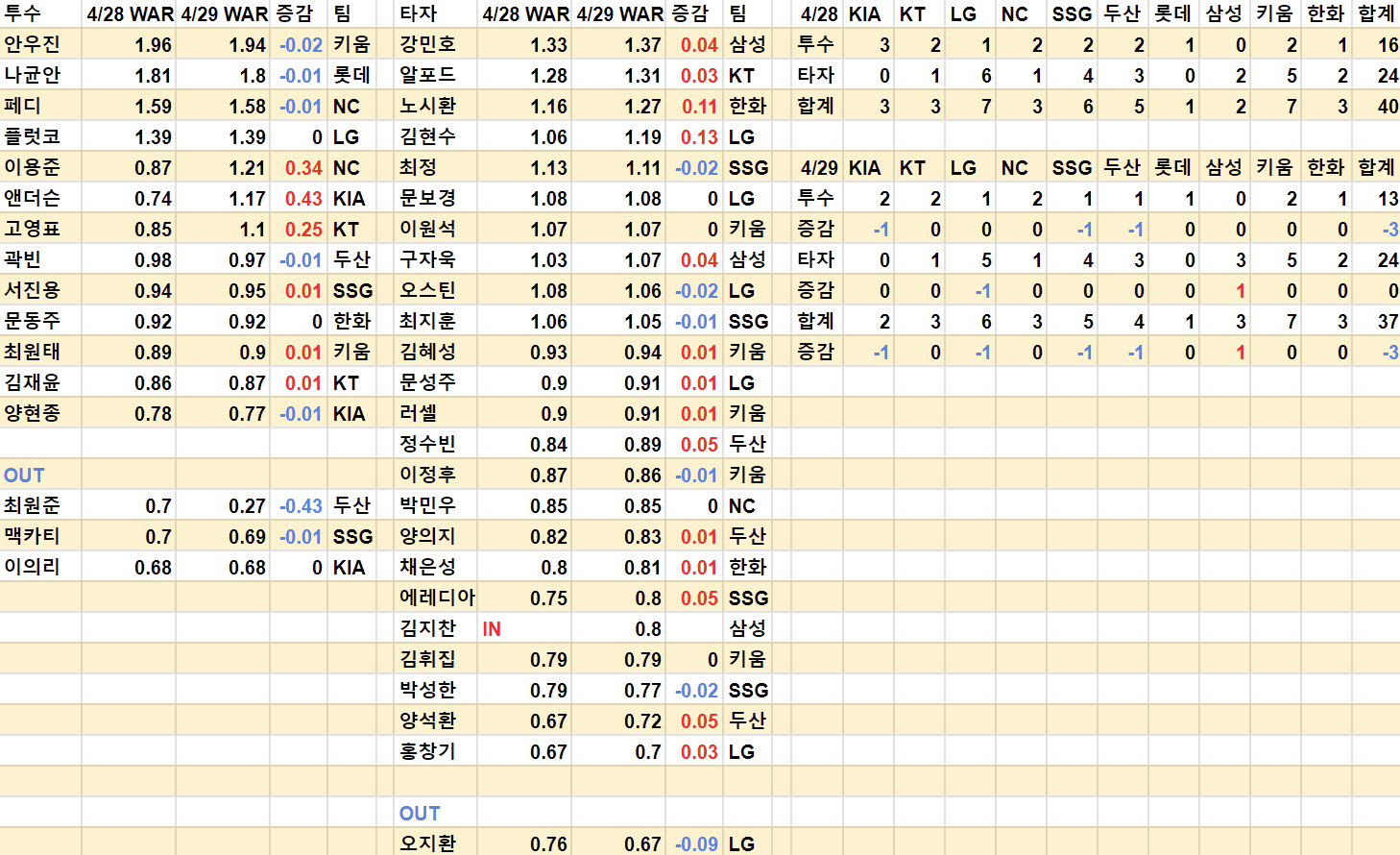 - - OUT : 최원준(두산), 맥카티(SSG), 이의리(KIA)