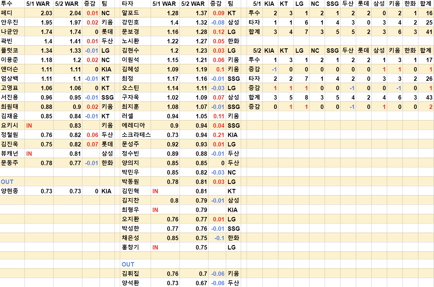 - - IN : 김민혁(KT), 최형우(KIA), 홍창기(LG)