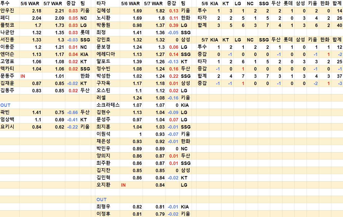 - - OUT : 곽빈(두산), 엄상백(KT), 요키시(키움)